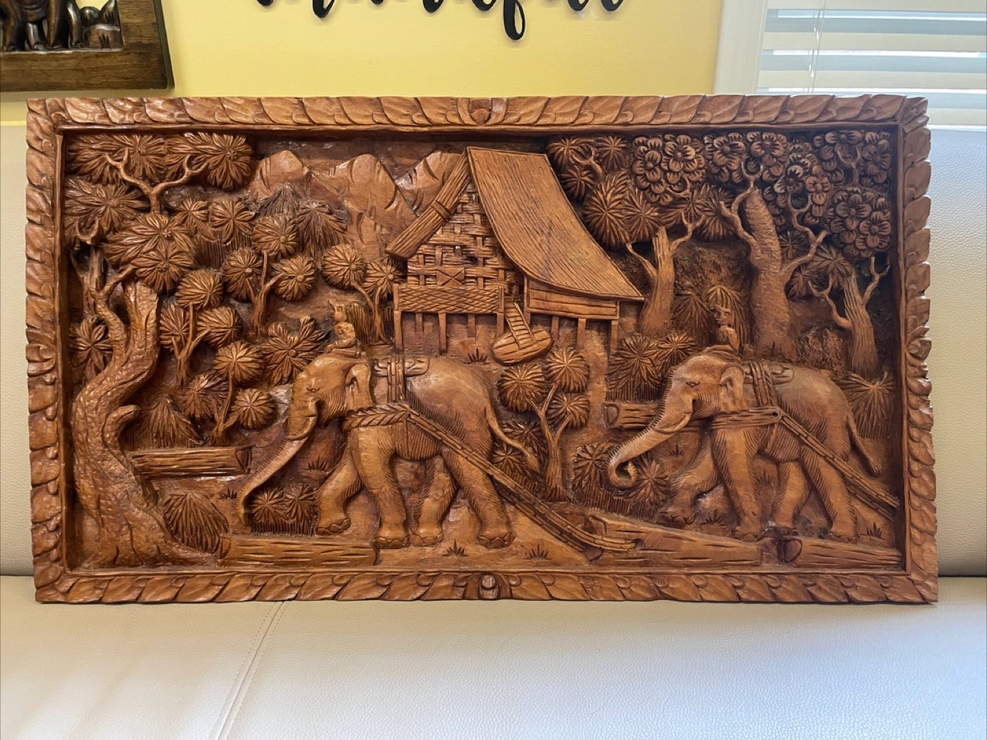 Beautiful hand carved wood panel featuring elephants and a traditional house. This piece would make a lovely addition to any home decor!