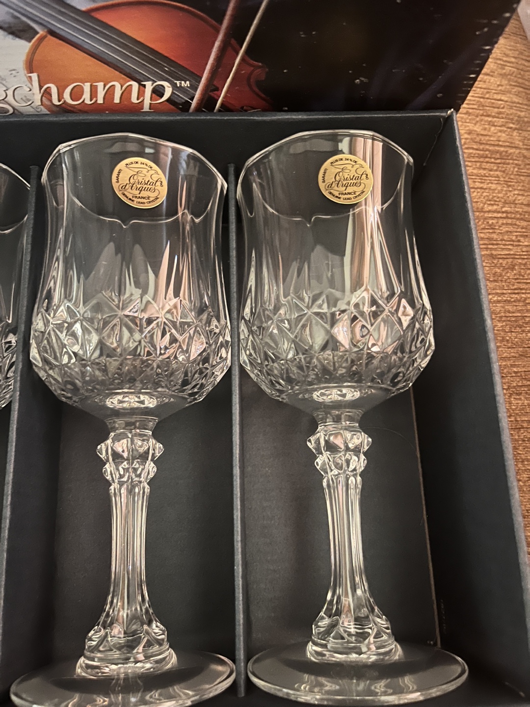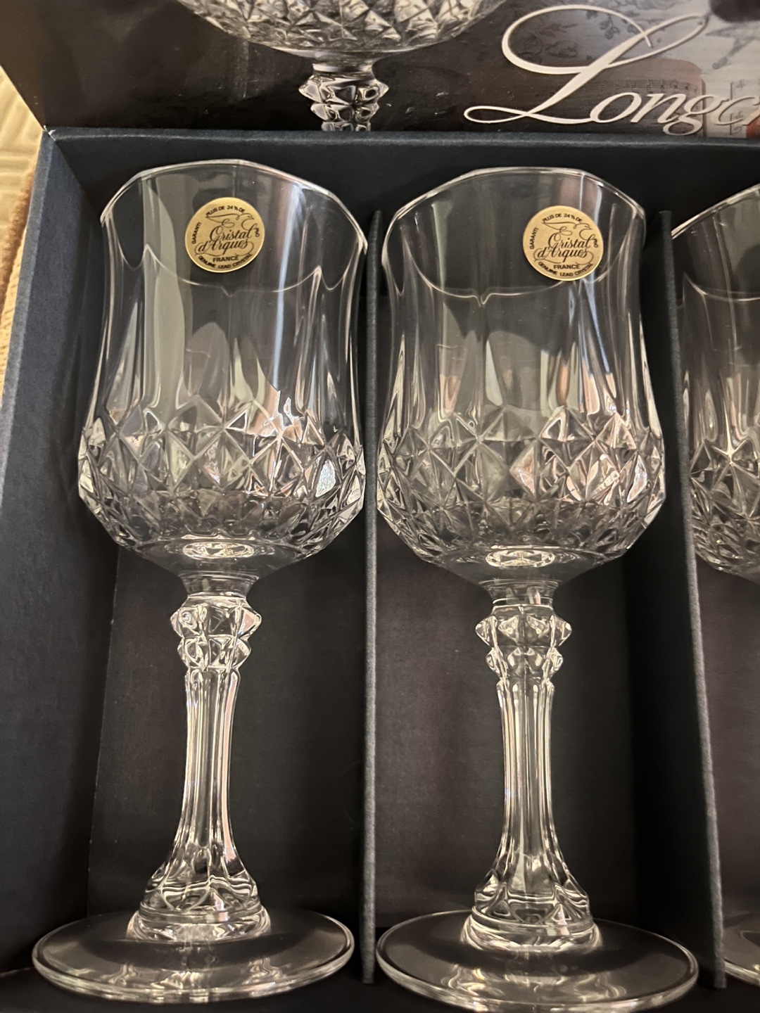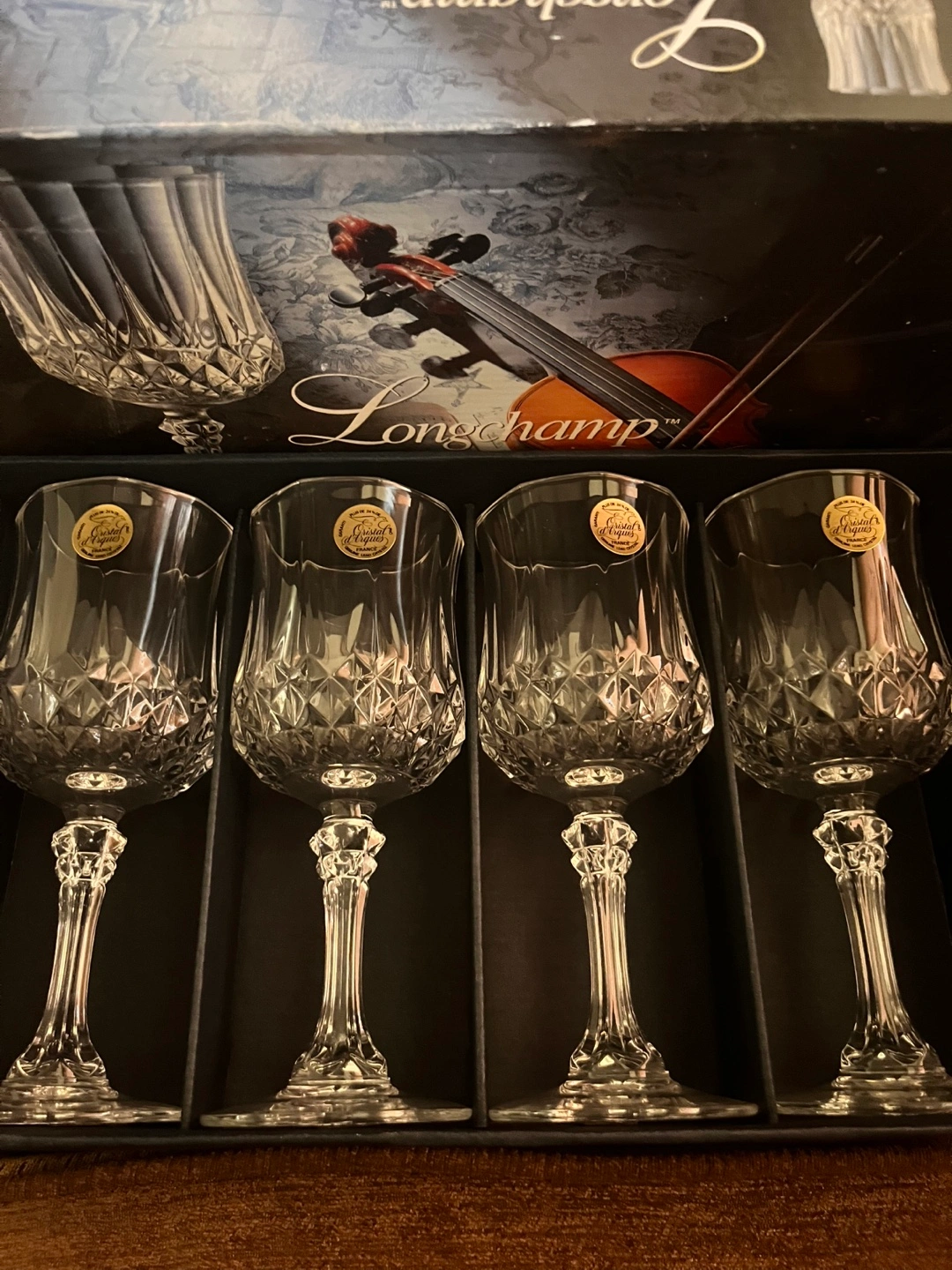 NEW!!! Selling a set of four Cristal d'Arques Longchamp wine glasses! They come in their original box. These glasses feature a beautiful, timeless design that would look great in any home