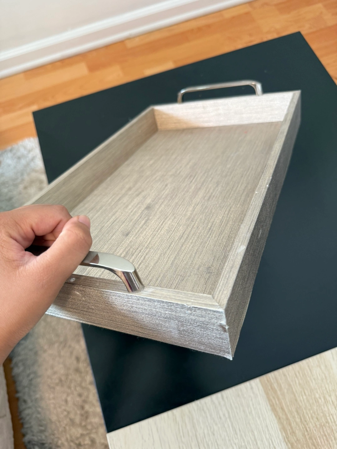 Selling a decorative wooden tray featuring silver handles. It's perfect for serving or displaying items around your home. The tray is in great condition and ready for a new home!