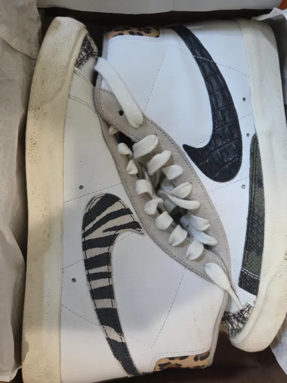 Selling a pair of Nike Blazer Mid '77 sneakers with a fun animal print design! They feature a mix of textures and patterns, including zebra stripes, crocodile skin, and leopard spots. These shoes are in good condition and ready for a new home they also come in original box