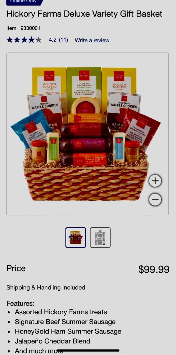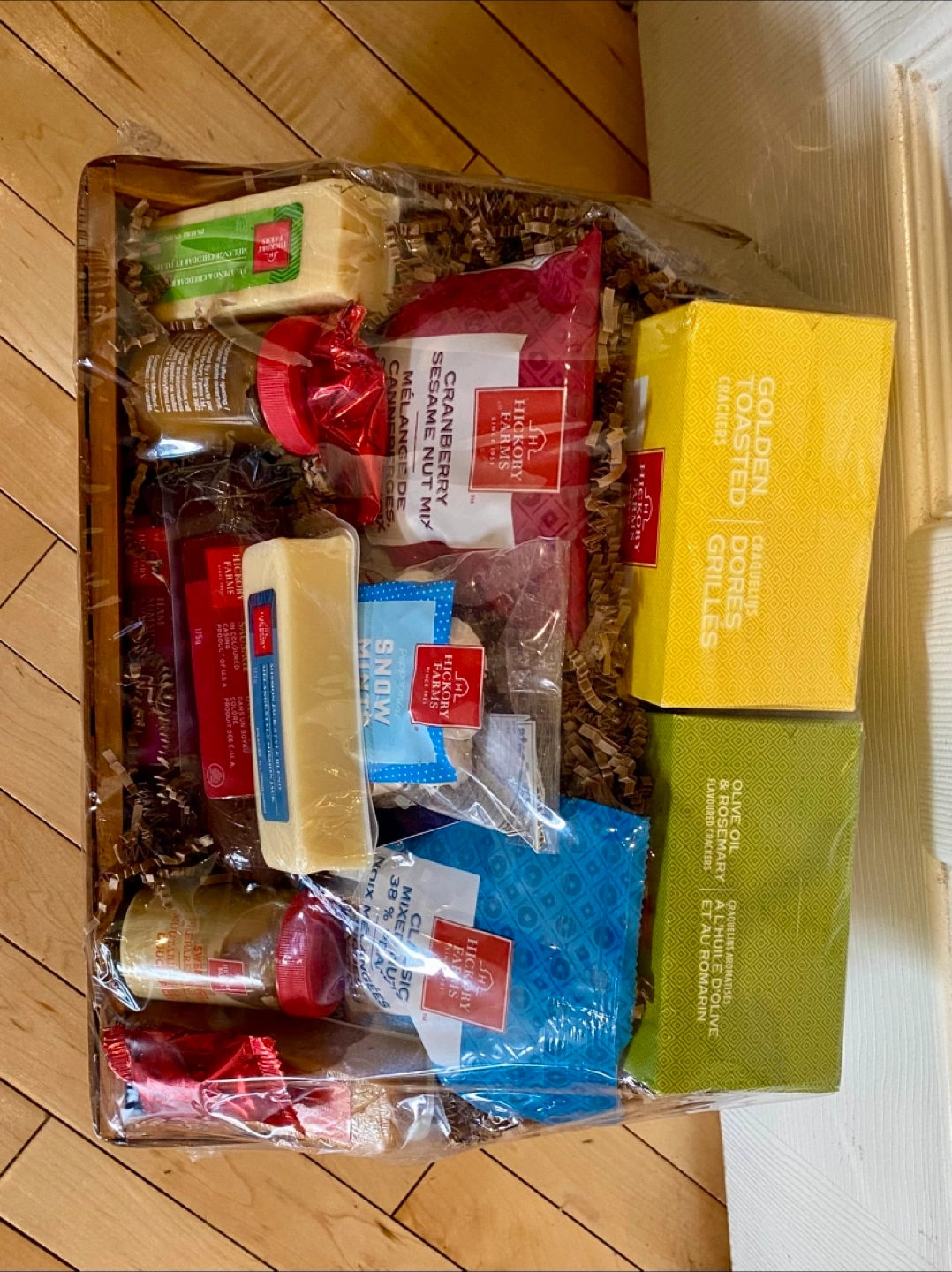 Selling a Hickory Farms Deluxe Variety Gift Basket! It includes assorted Hickory Farms treats like Signature Beef Summer Sausage, HoneyGold Ham Summer Sausage, and Jalapeño Cheddar Blend