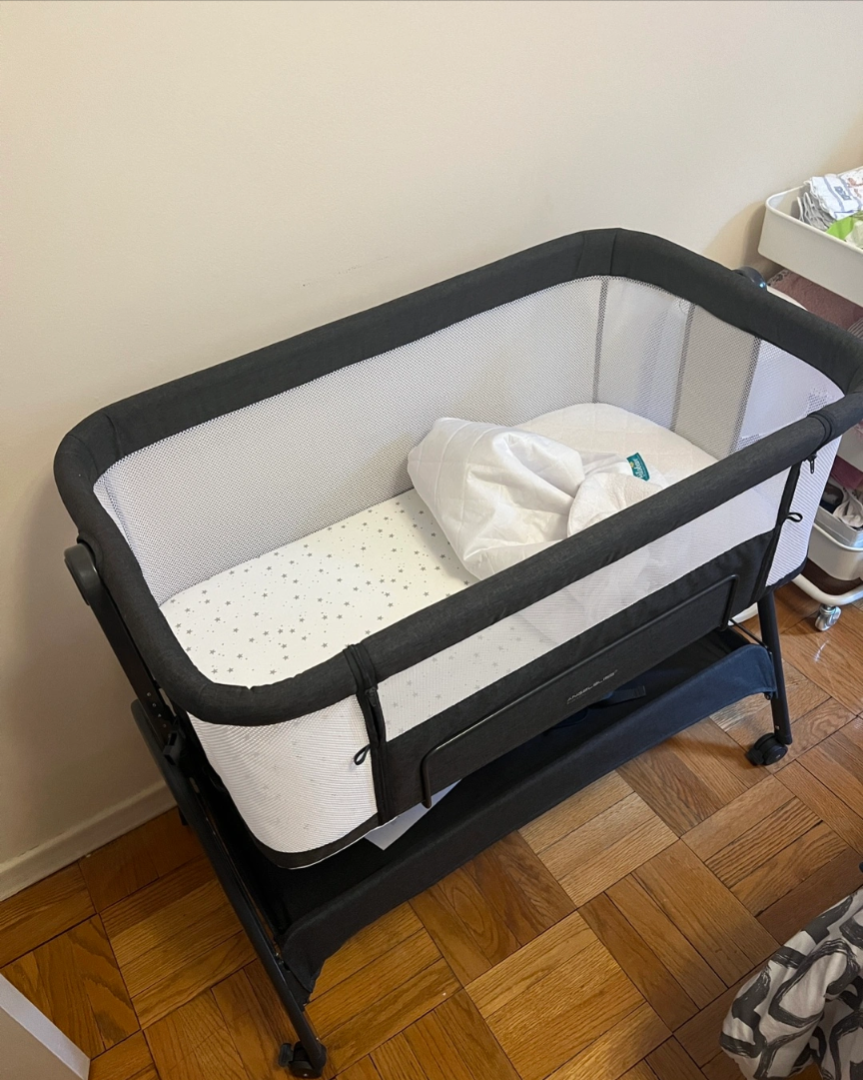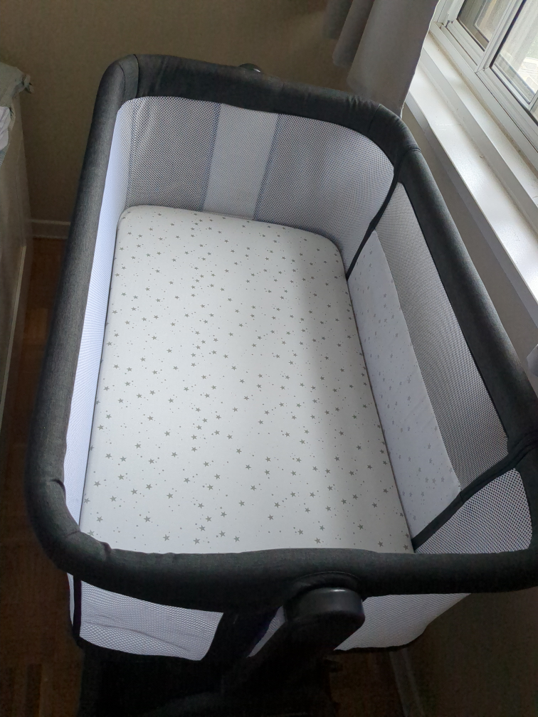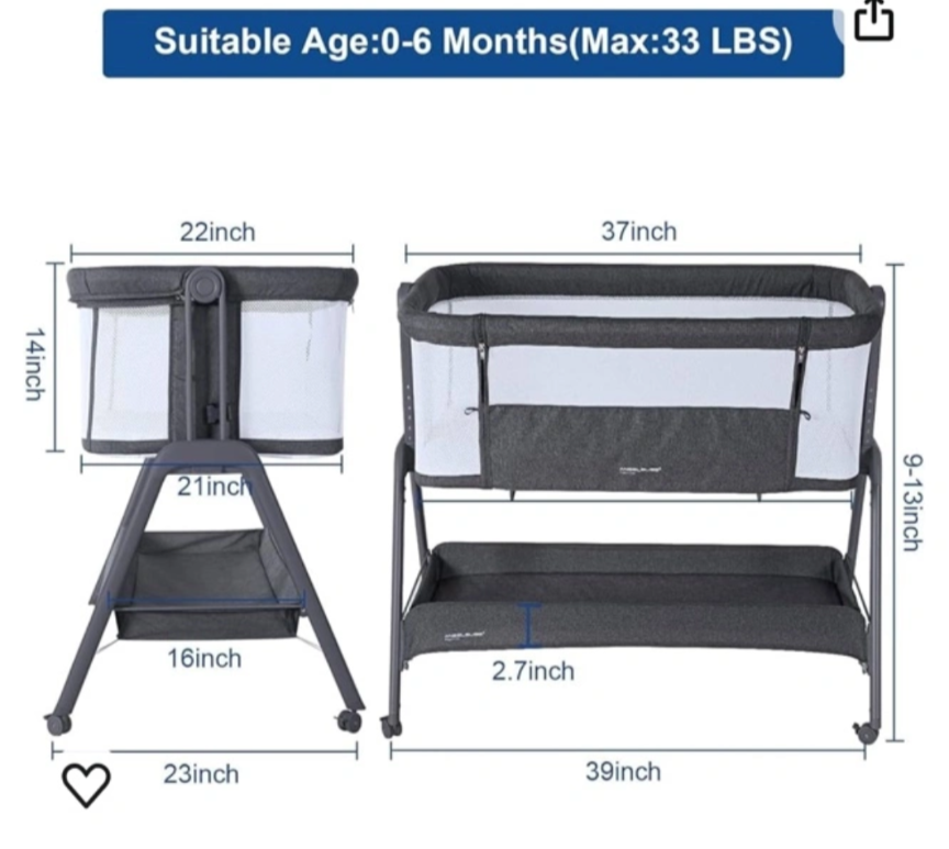 Selling a co-sleeping baby bassinet. Suitable for ages 0-6 months (Max: 33 LBS). Dimensions are 22inch x 14inch x 21inch and 37inch x 9-13inch x 39inch.