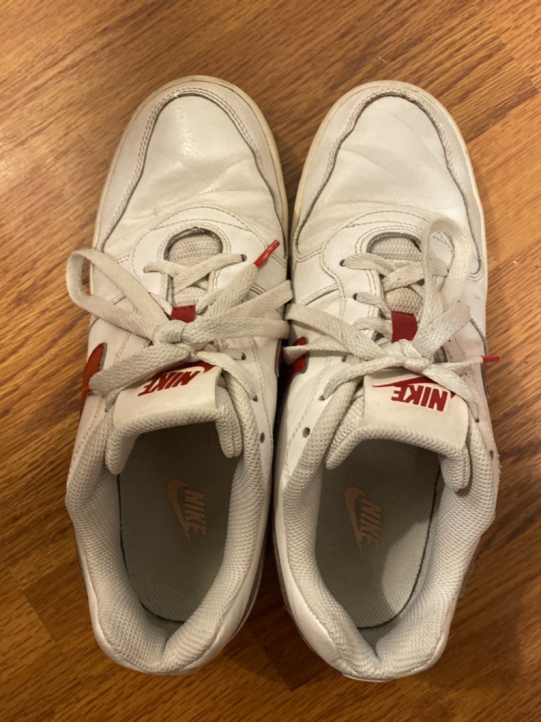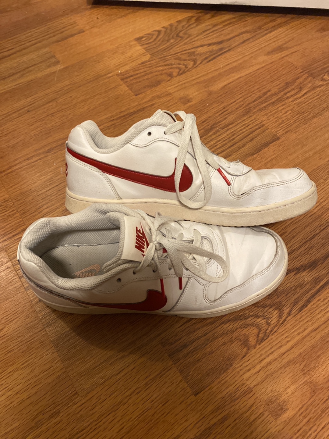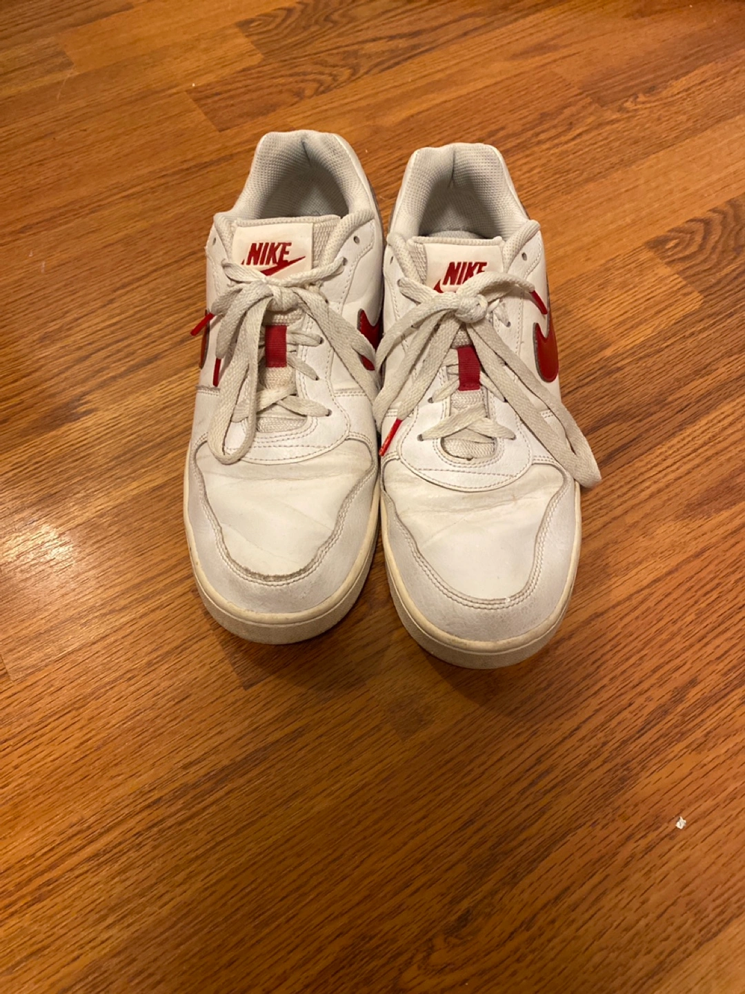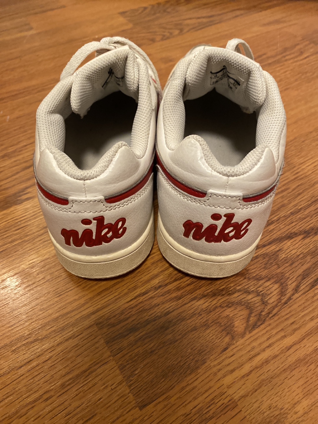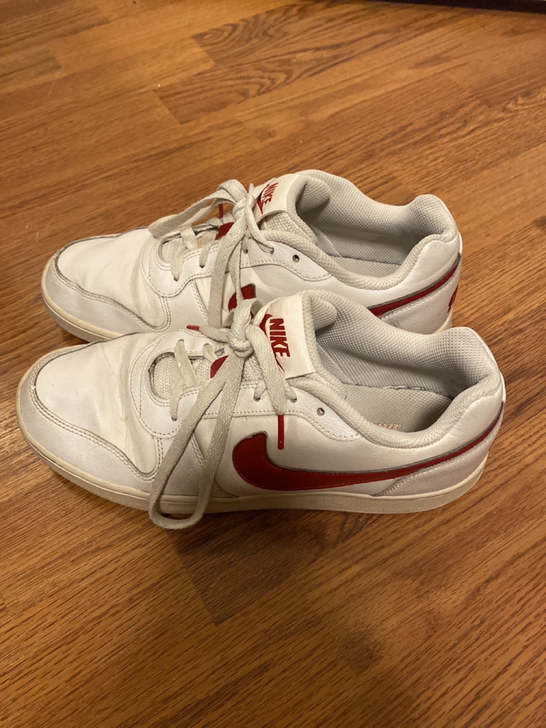 Selling a pair of Nike Court Vision Low sneakers in white with red accents. Great for adding a hint of vintage red and white to a casual outfit or hitting the court