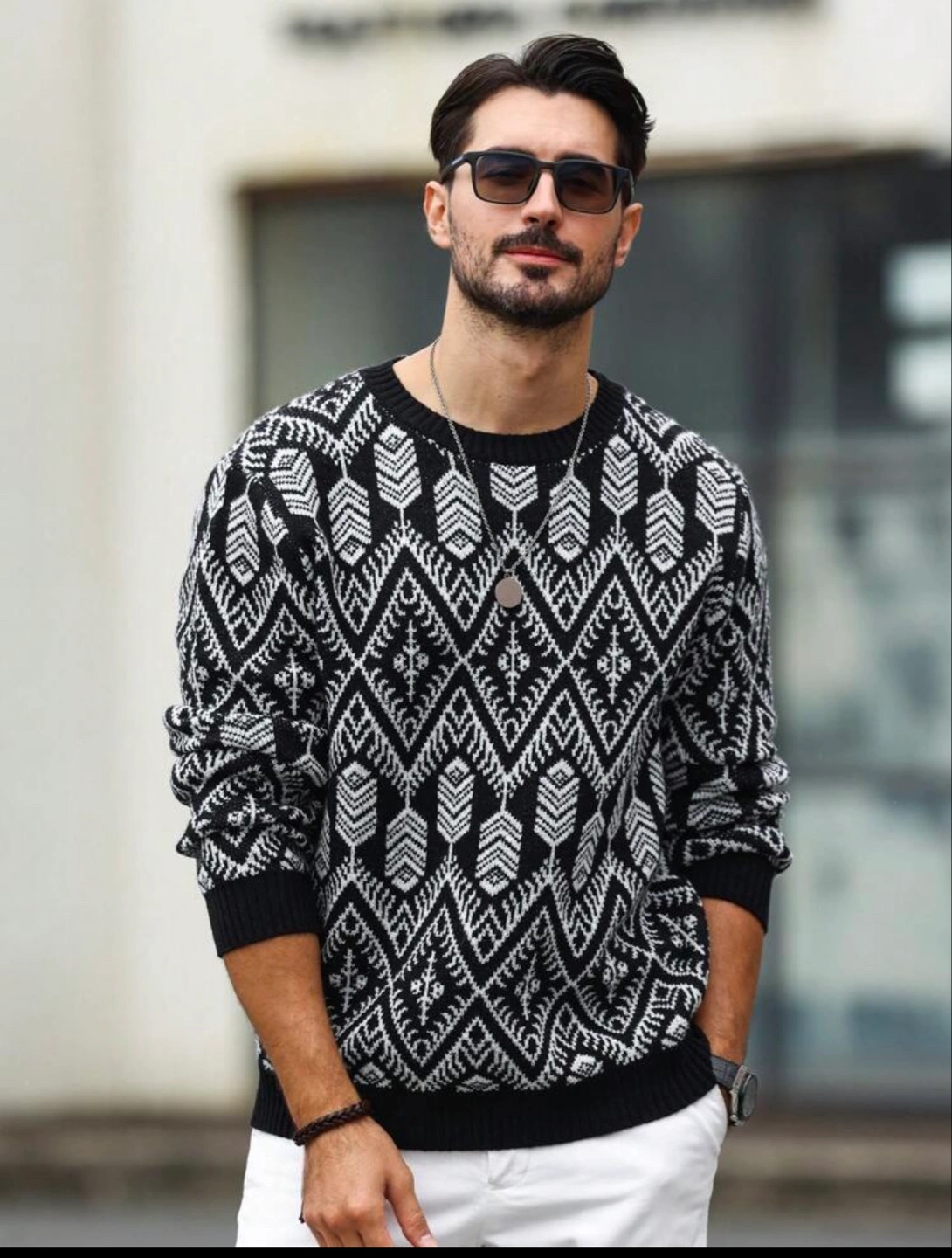 A stylish black and white patterned knit sweater. Perfect for adding a touch of flair to your wardrobe!