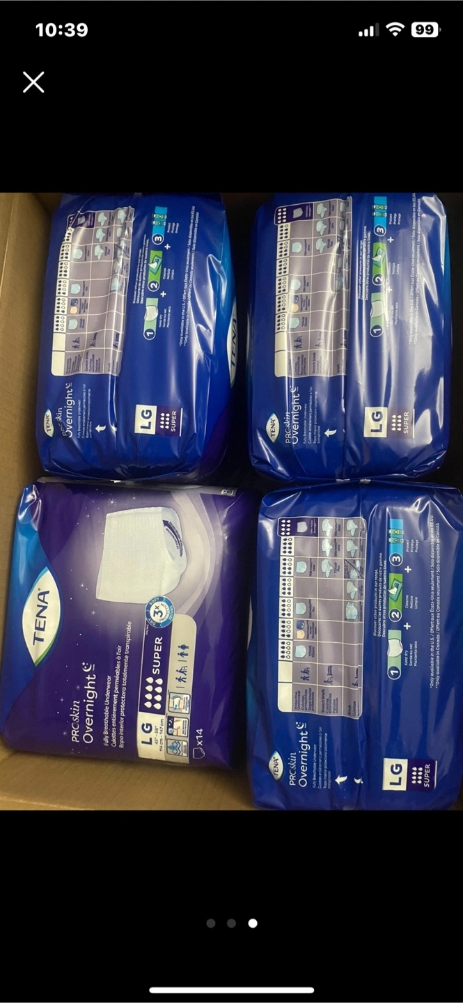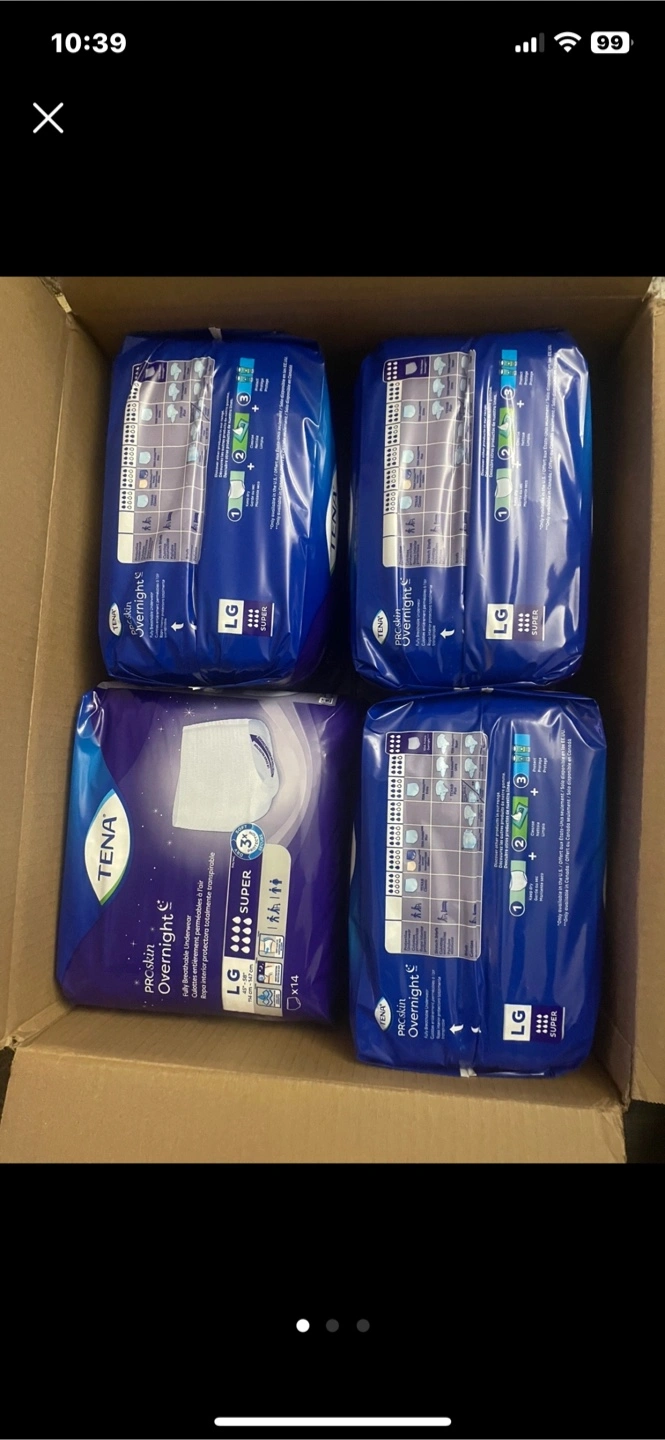 Selling a pack of Tena ProSkin Overnight Underwear, size Large. 36 bags These are fully breathable and designed for overnight protection. Also available is a pack of Tranquility Premium OverNight Underwear, size XL 6 bags,designed for maximum protection. Each for $15 if u buy all of them u get discount txt me more details check out my other listings door pick up only Markham and Lawrence avenue east.