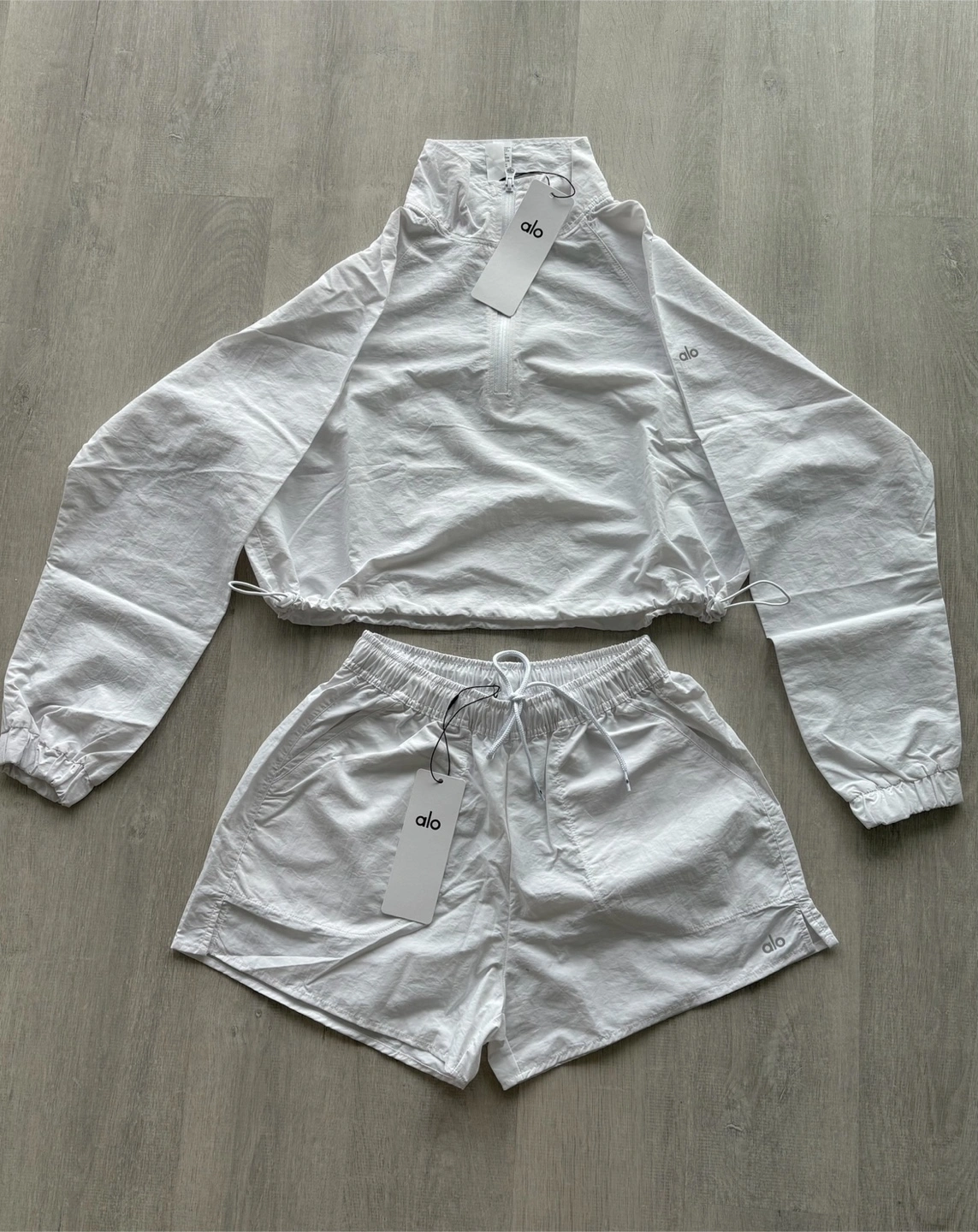 Selling a brand new ALO Yoga set! This includes a pair of shorts and a matching jacket, both in a crisp white colour. Perfect for workouts or just lounging around in style. The material is lightweight and comfortable, making it ideal for any activity. Retails for 246!