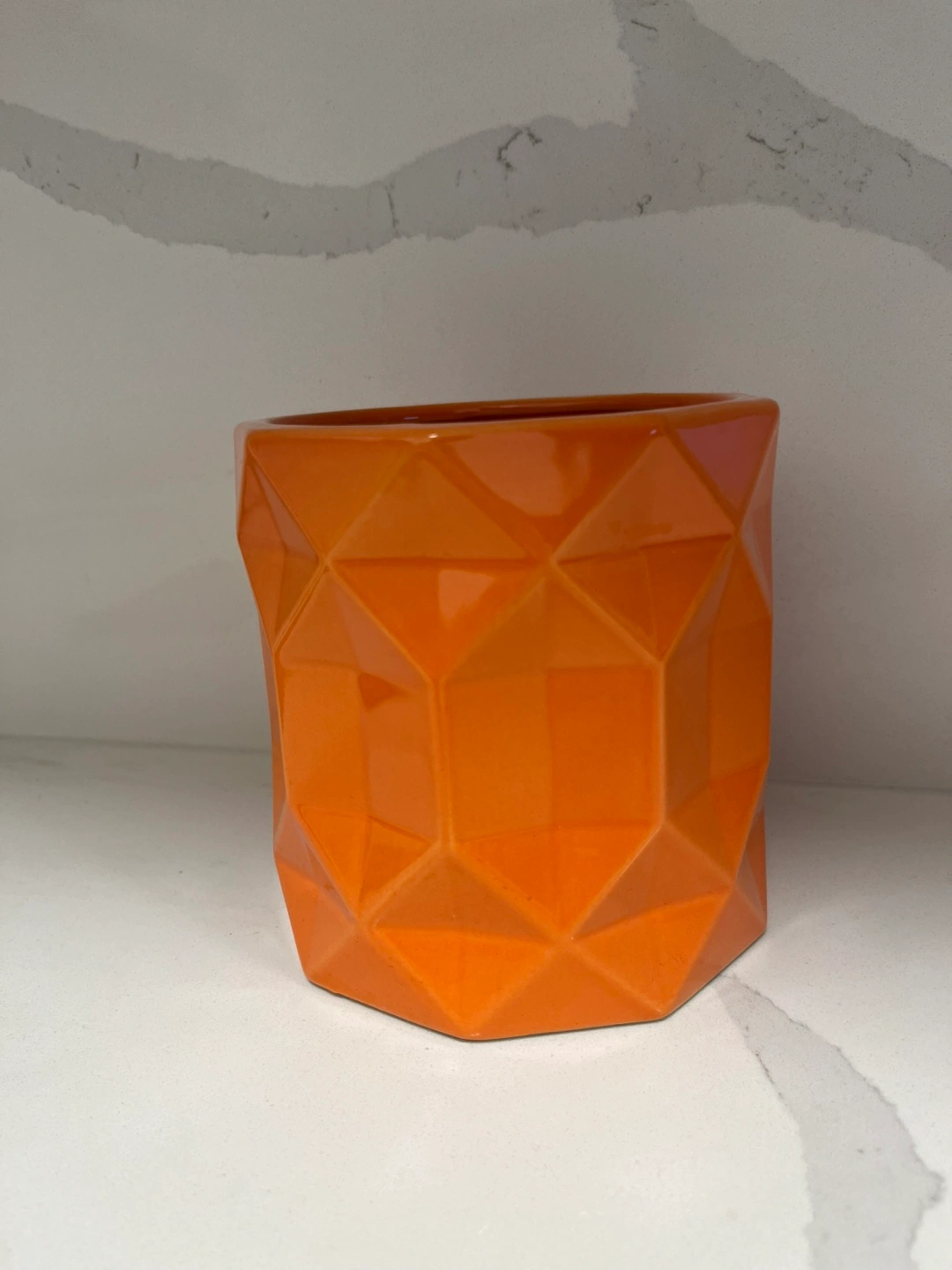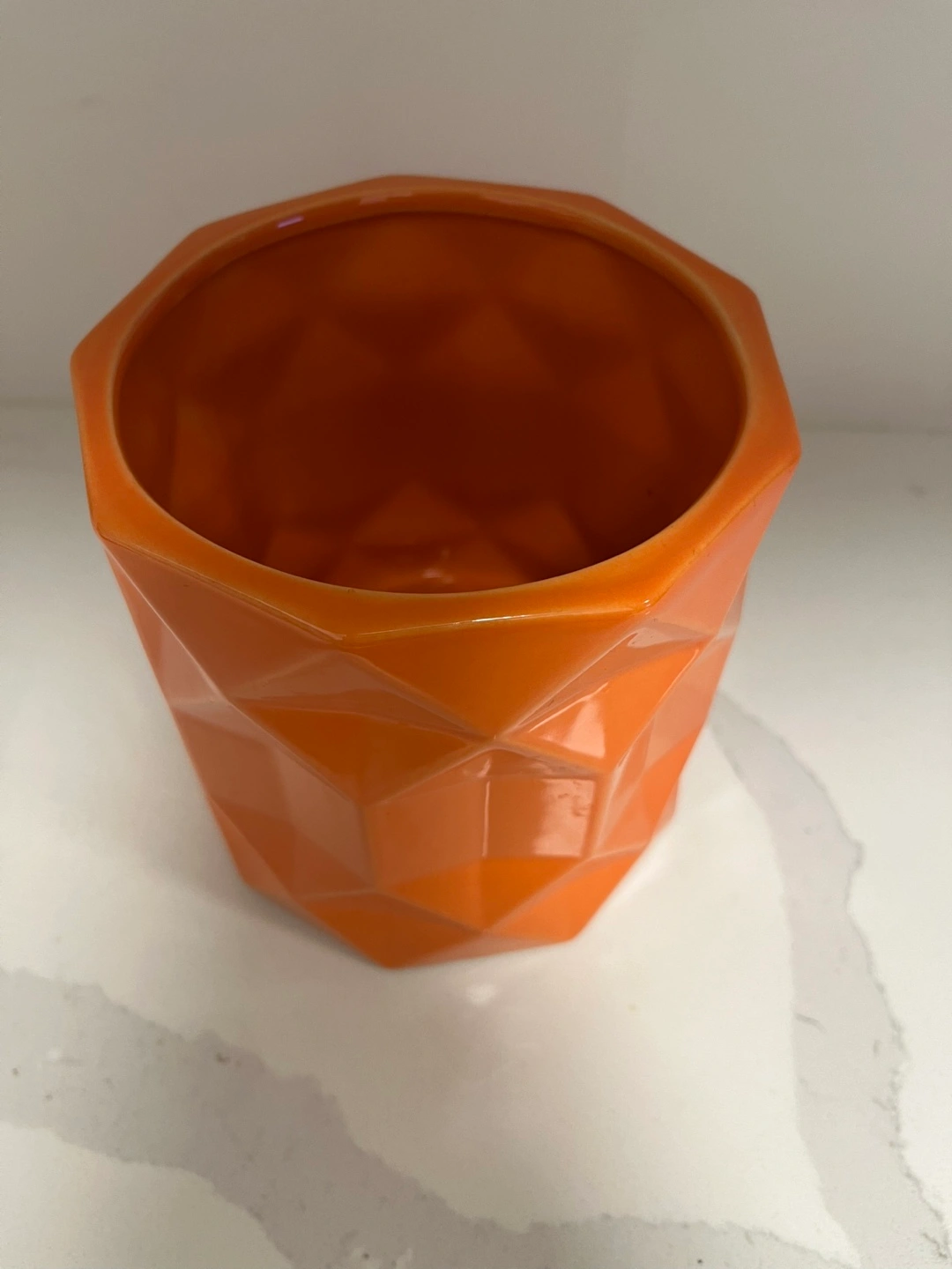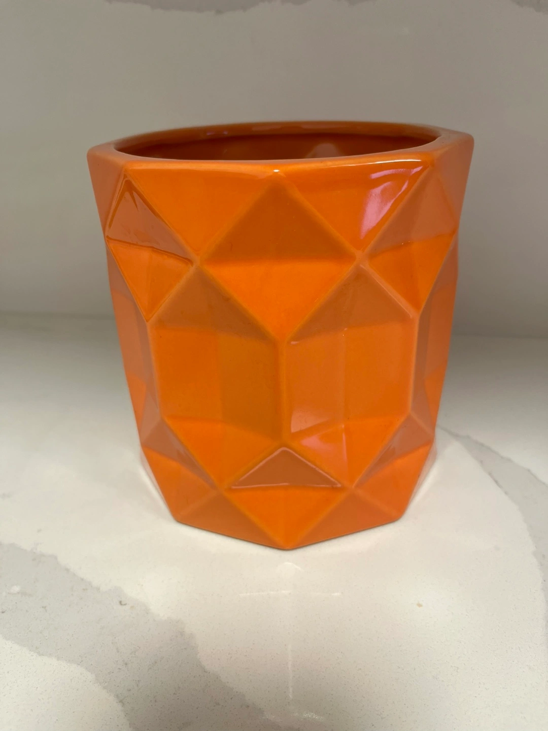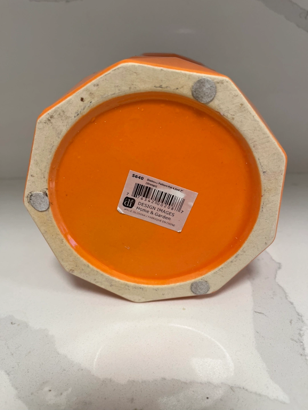 Orange plant pot with interesting pattern/texture. Design Images Home & Garden brand. 5.5” tall and 5.25” across. Adds a great pop of colour to your plant collection!