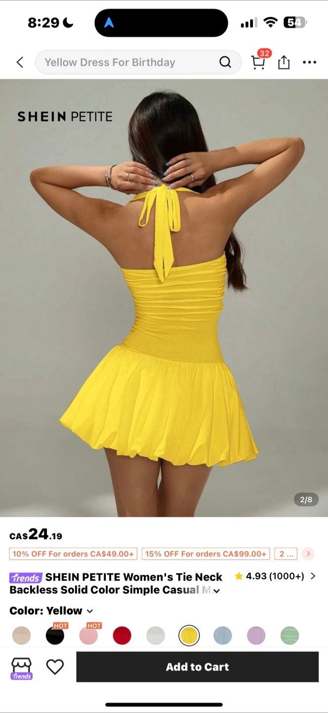 Selling a SHEIN PETITE women's dress! It features a tie neck and backless design, perfect for a simple and casual look. The colour is yellow and it was originally CA$24.19.