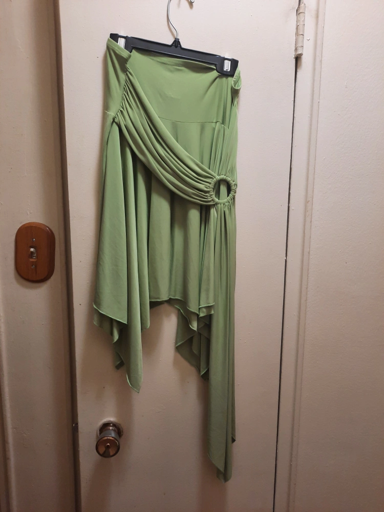 Selling a green asymmetrical skirt. It features a draped design and a ring detail. Perfect for adding a unique touch to your wardrobe!