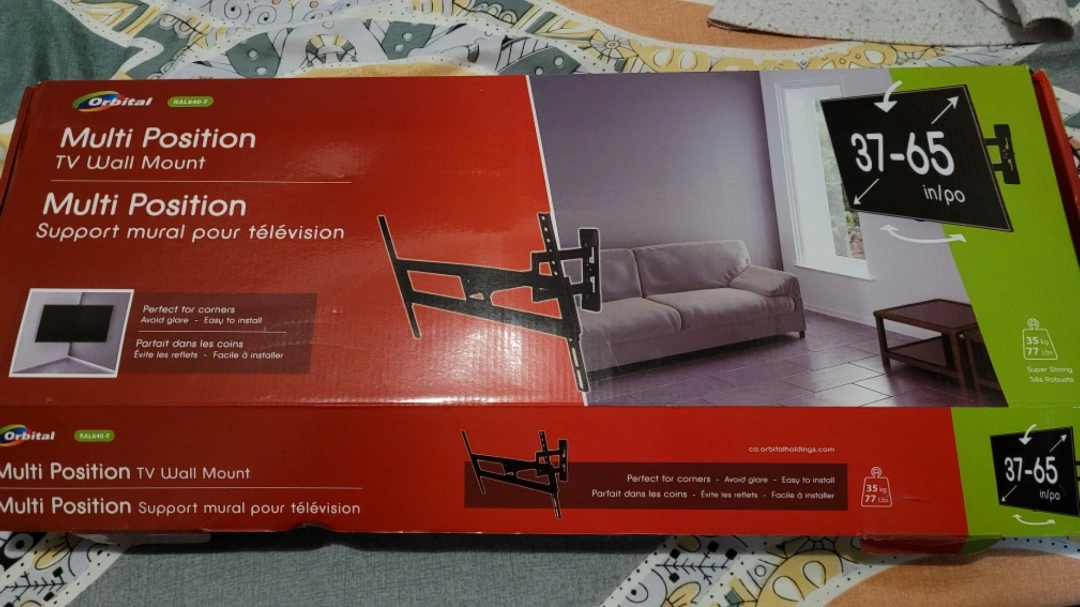 Selling a Never used, Orbital Multi Position TV Wall Mount! It's suitable for TVs ranging from 37 to 65 inches and can hold up to 35 kg (77 lbs). It's perfect for corners and is easy to install. The box is included!