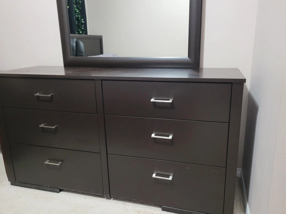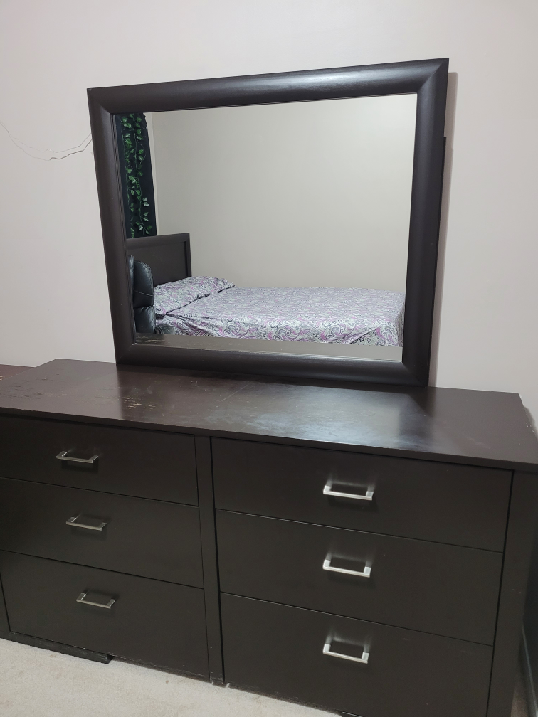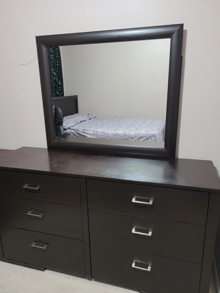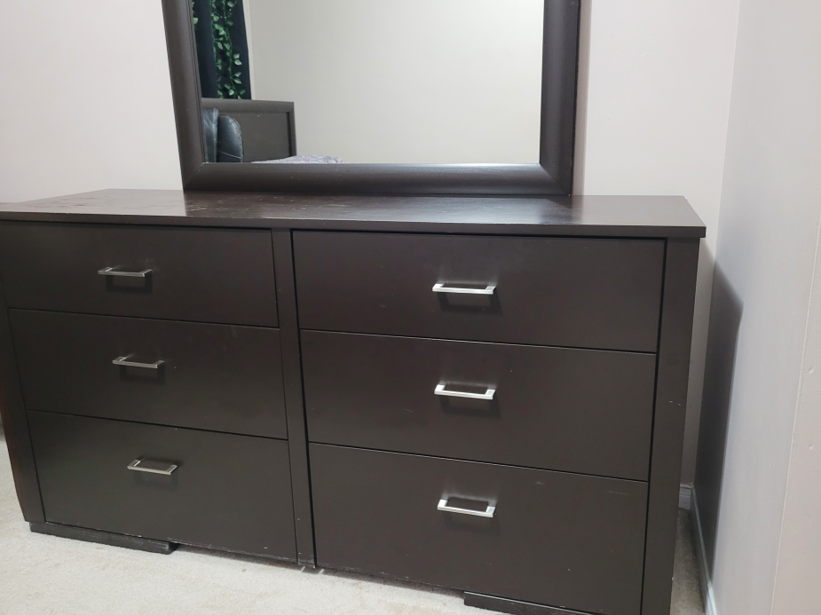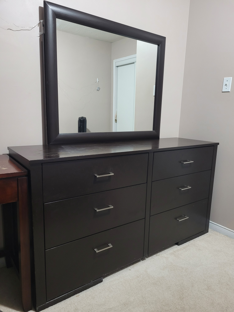 Selling a dark brown dresser with a matching mirror. It features six spacious drawers, perfect for organizing your clothes and belongings. The dresser and mirror are in good condition and would be a great addition to any bedroom!