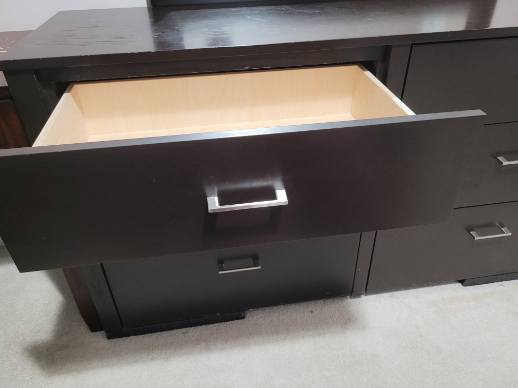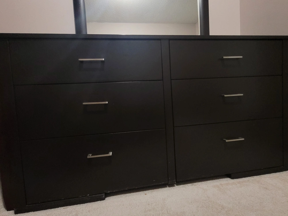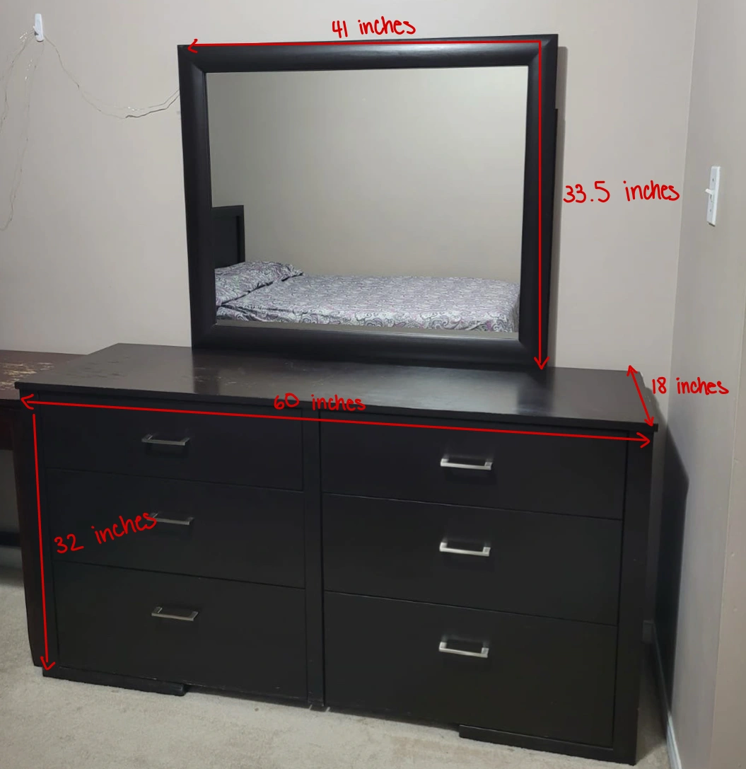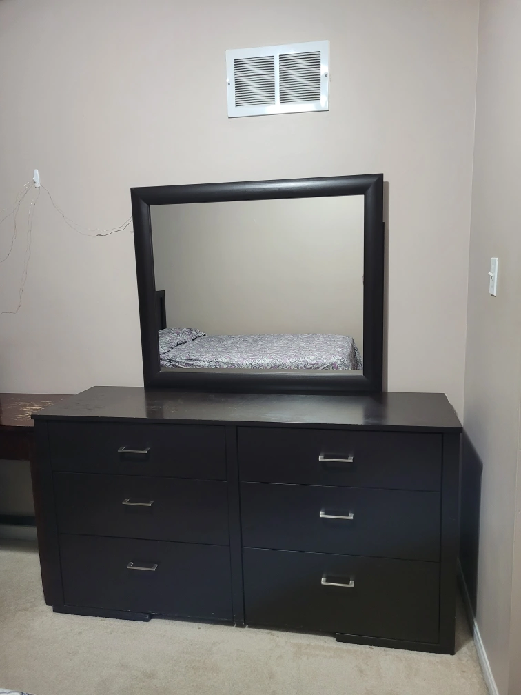 Selling a dark brown dresser with a matching mirror. It features six spacious drawers, perfect for organizing your clothes and belongings. The dresser and mirror are in good condition and would be a great addition to any bedroom!