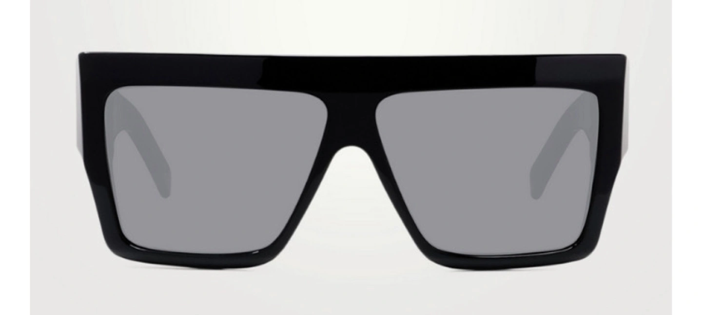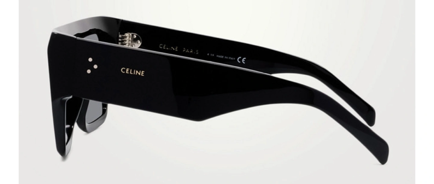 Square topline, oversized sunglasses. CELINE logo lettering and the iconic three-dot detail at the temples.