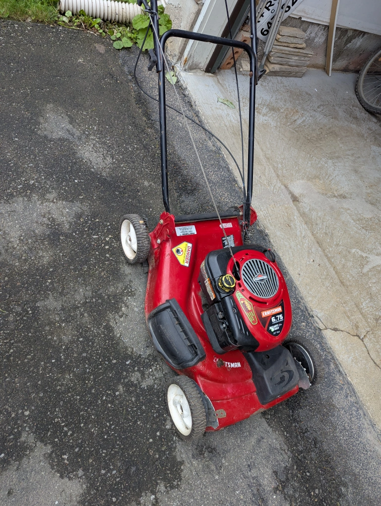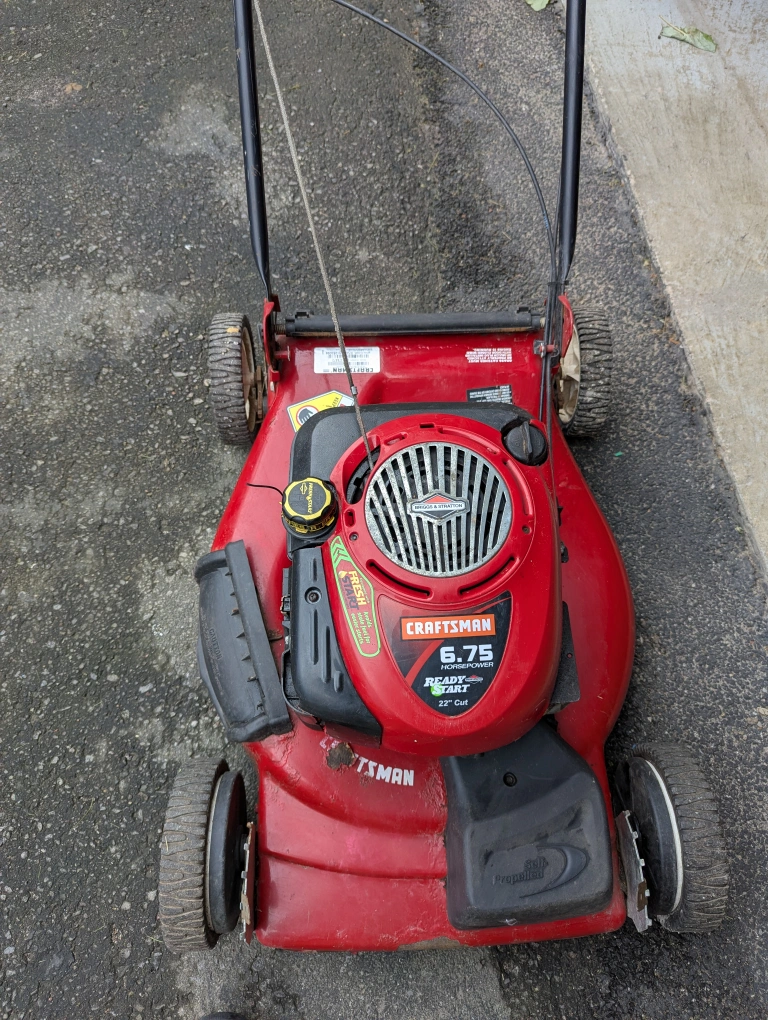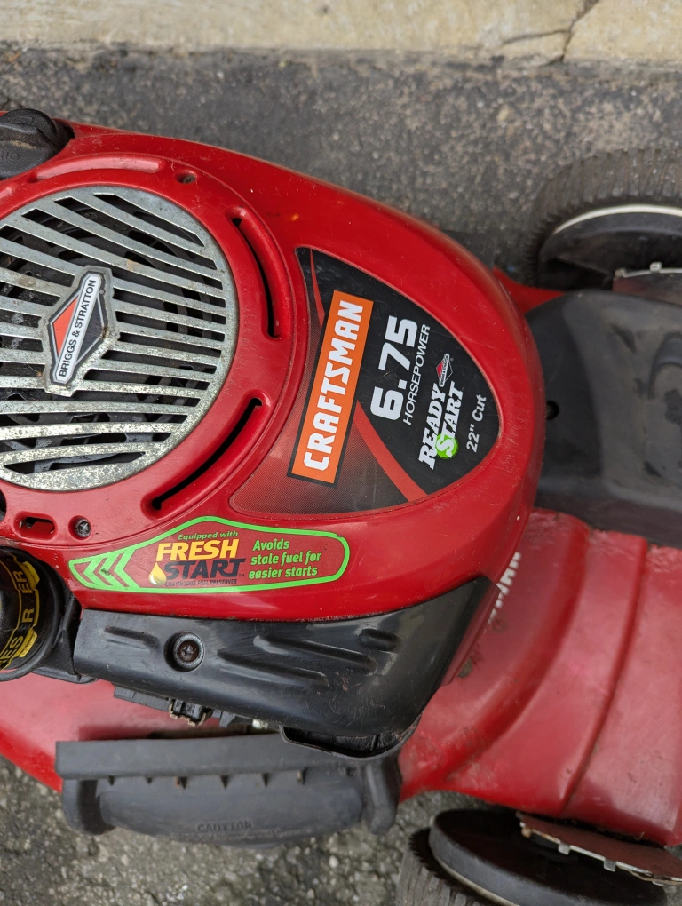 I'm selling a Craftsman lawn mower. It's a 6.75 horsepower model with a 22" cut. It's self-propelled, which makes mowing the lawn a lot easier. It uses a Briggs & Stratton engine and has a Ready Start system. Great working condition!