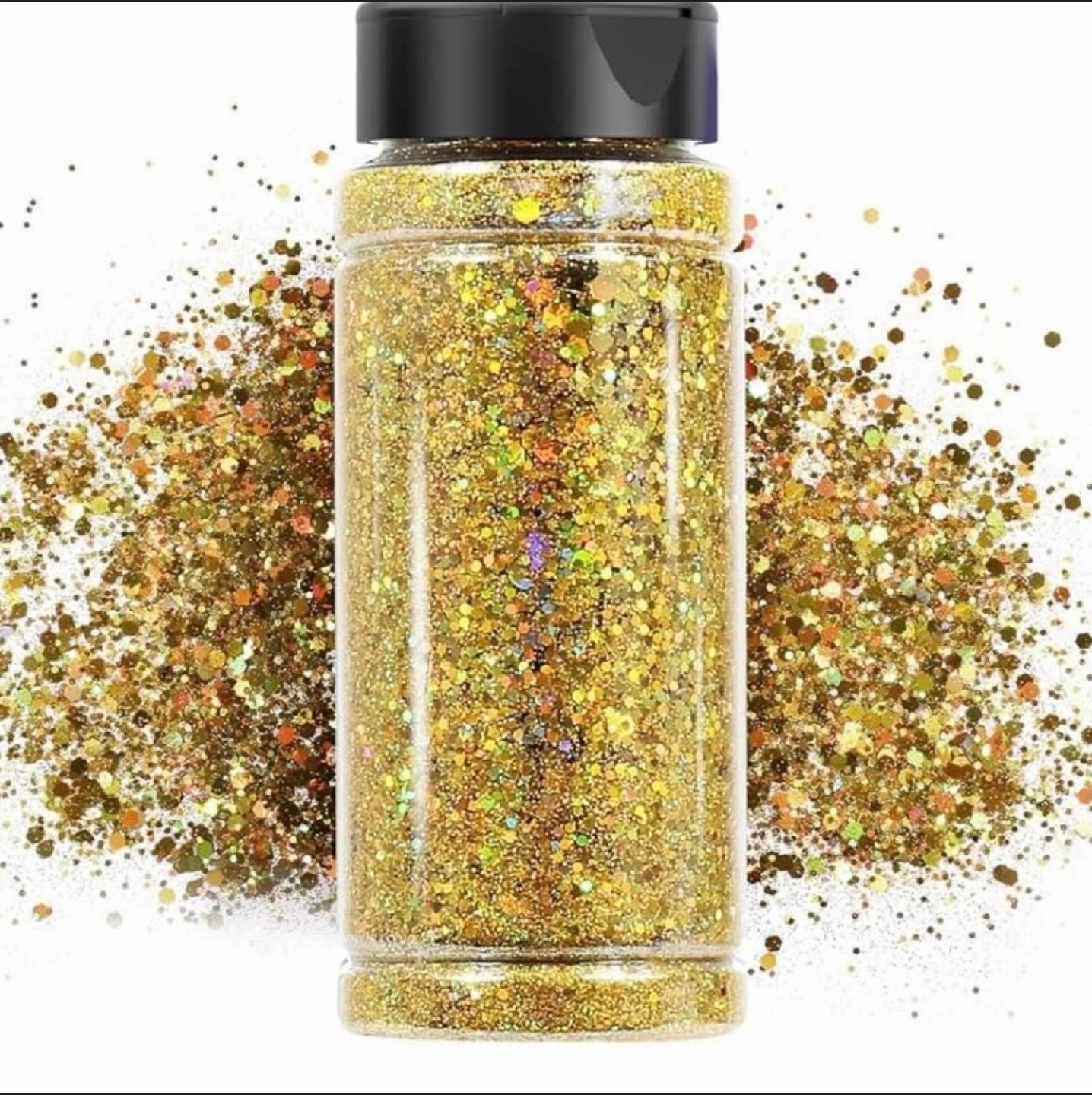 Chunky cyan gold glitter! Perfect for crafts, decorations, or adding a little sparkle to your life. The glitter is a beautiful, shimmering gold colour.