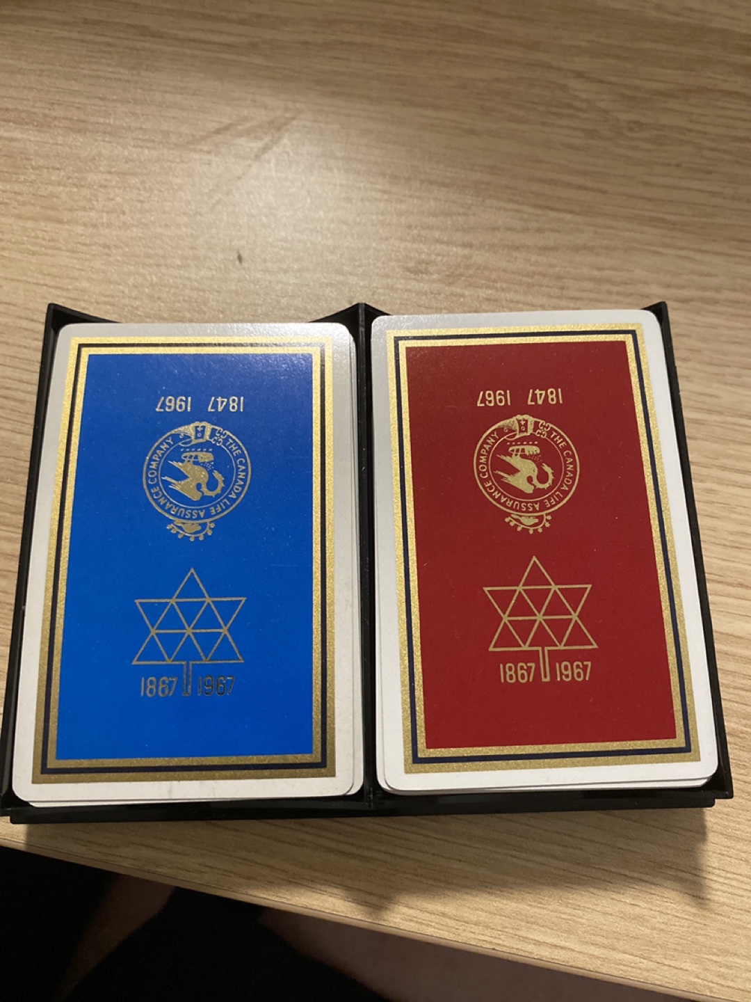 Here are some playing cards from The Canada Life Assurance Company. They commemorate the years 1847-1967 and 1867-1967. One deck is blue and the other is red
