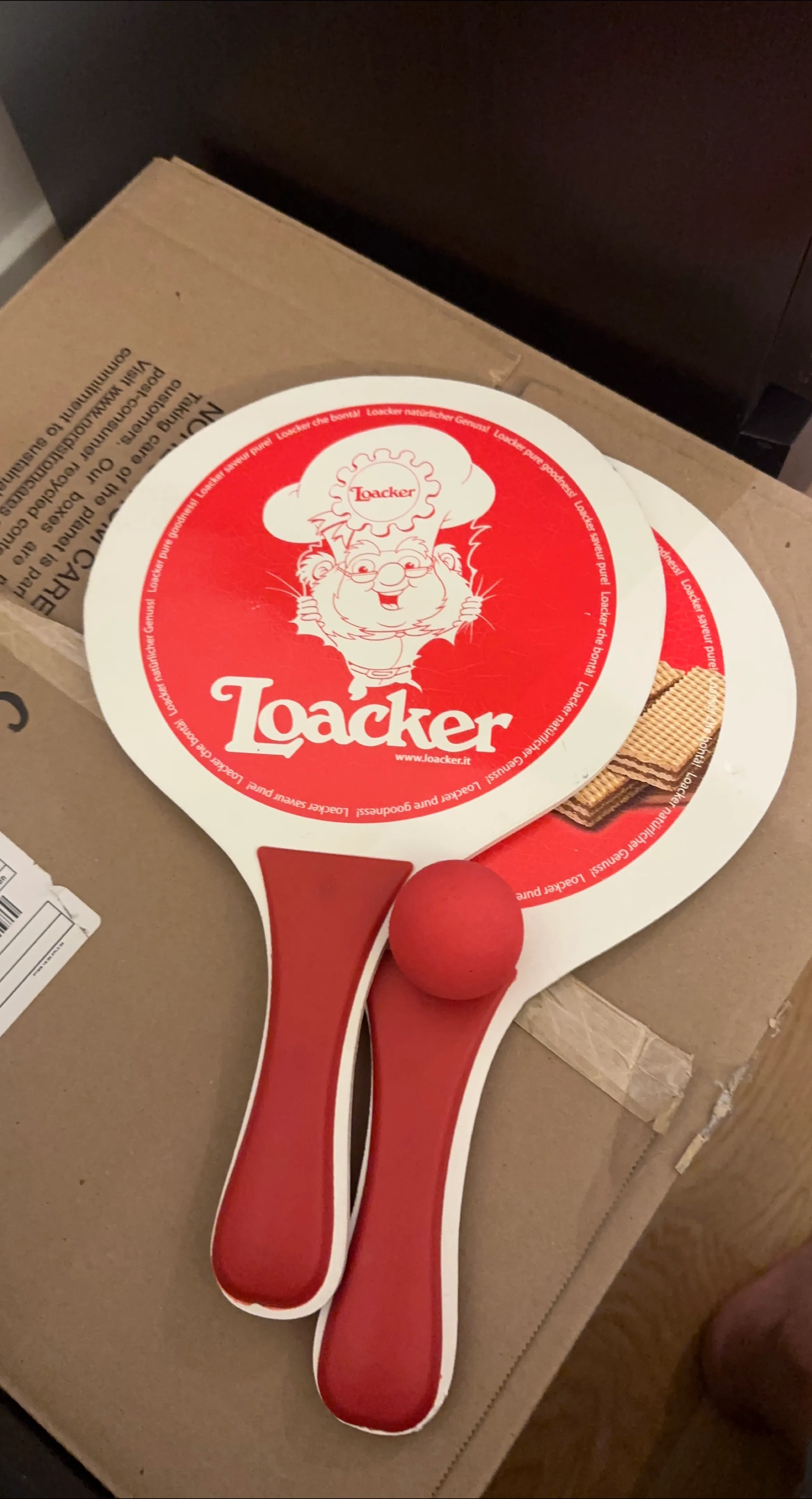 Selling a Loacker paddle ball set. This set includes two paddles and a ball, perfect for some fun outdoor play! The paddles feature the iconic Loacker branding. Great for kids and adults alike