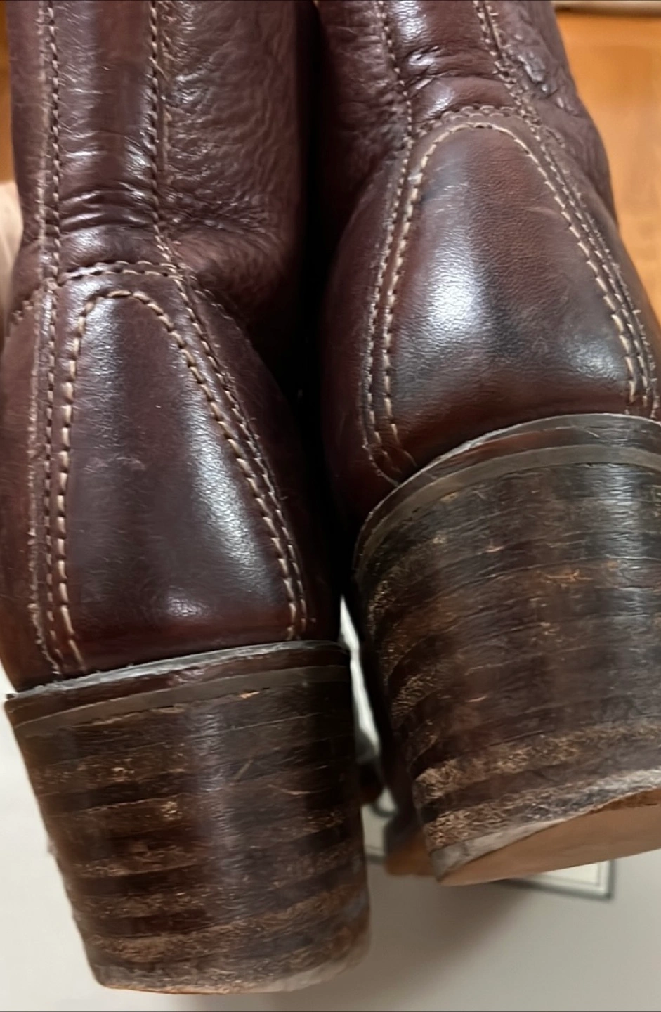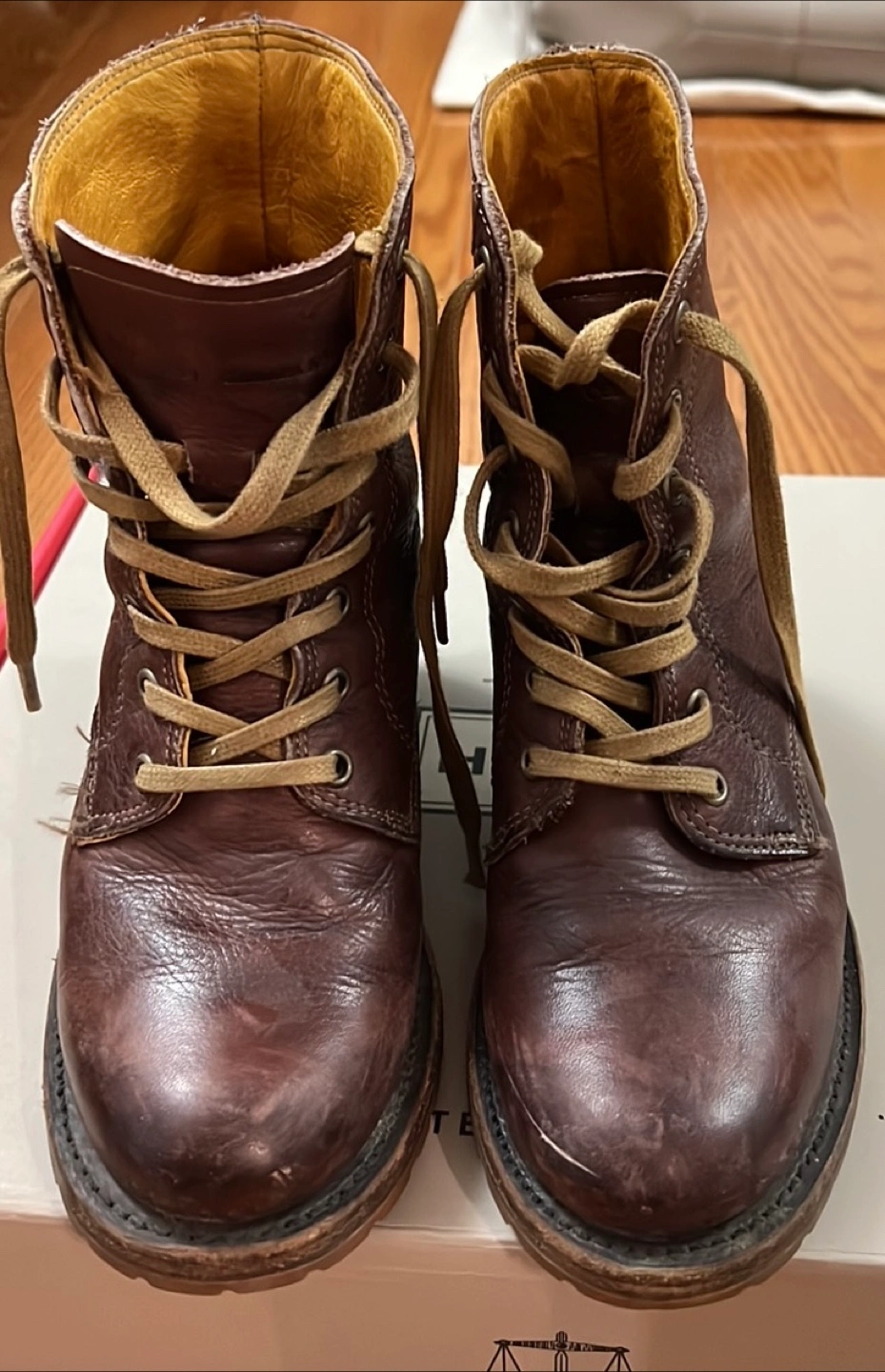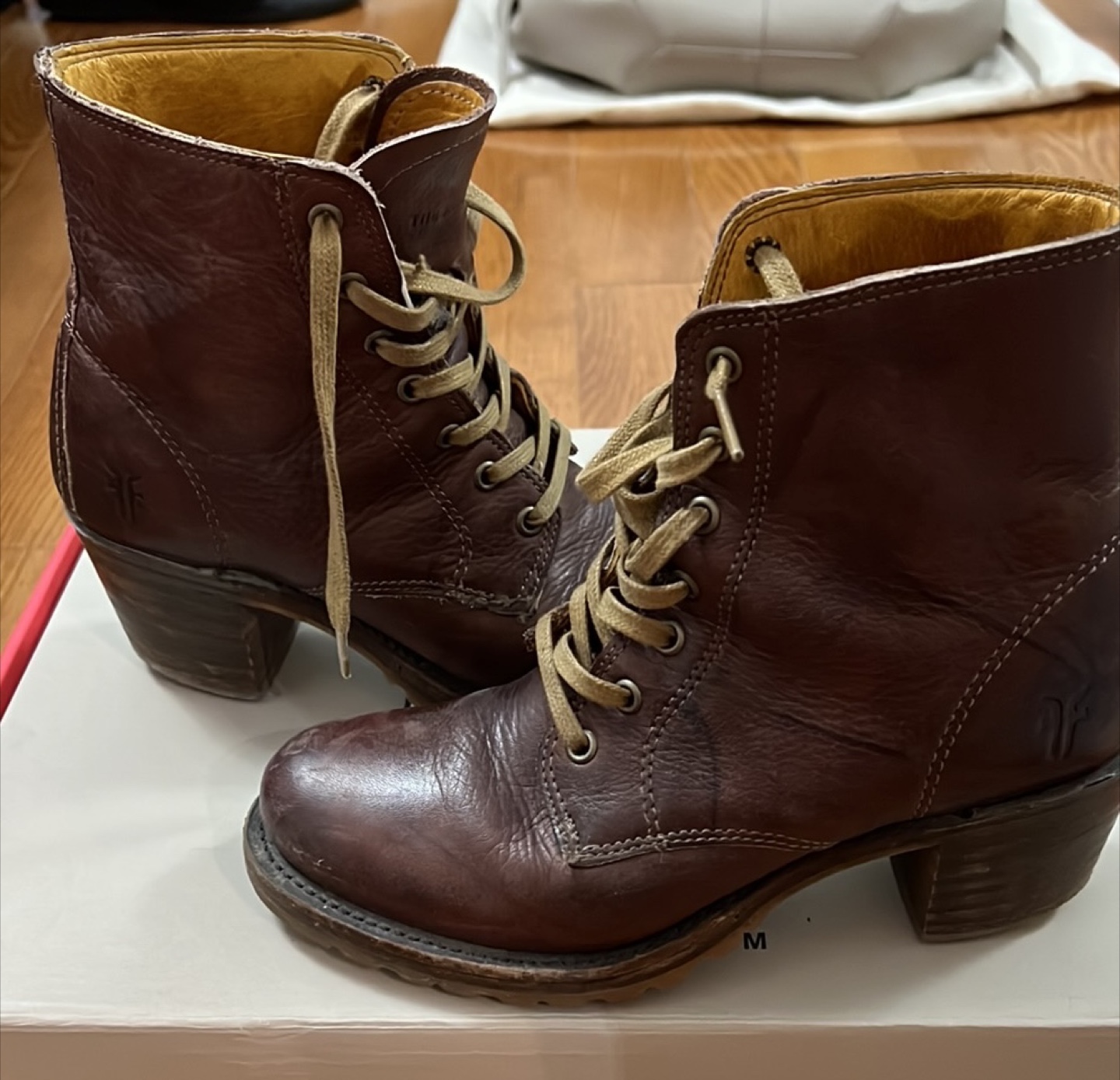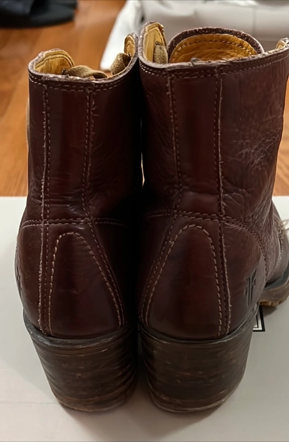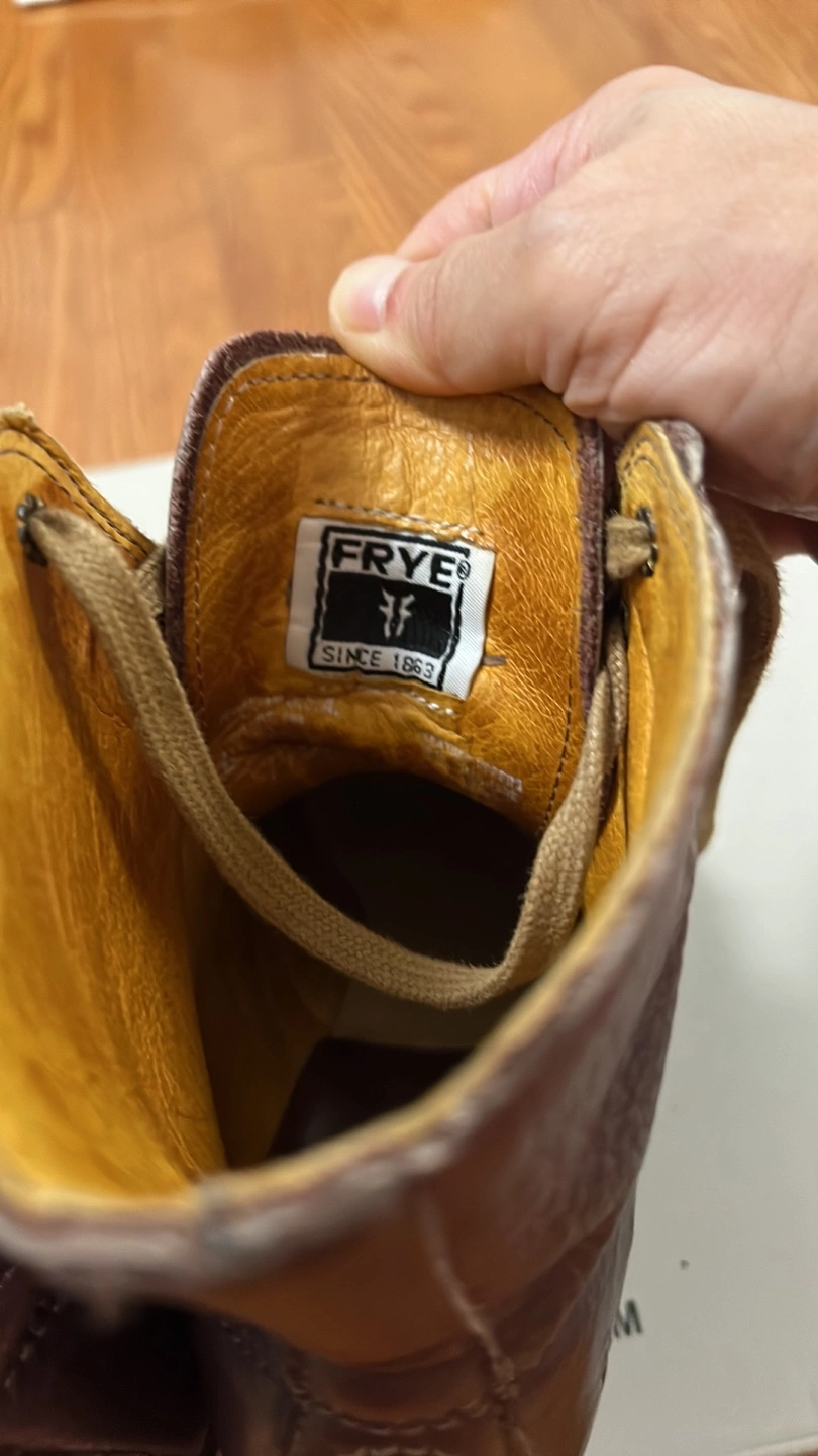These Frye ankle boots are a stylish addition to any wardrobe! They are made of brown leather and have a lace-up design. There are some signs of wear, but they have lots of life left.