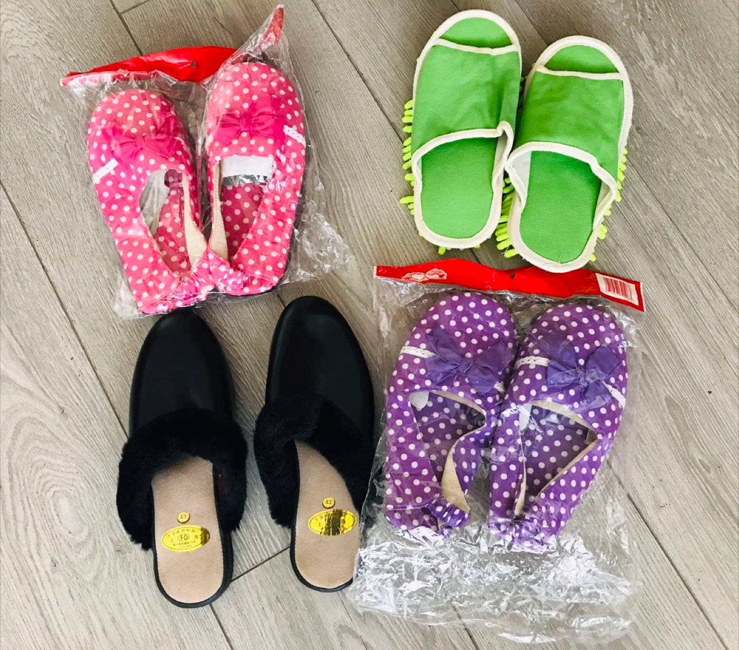 There are pink polka dot slippers, green slippers, black slippers with fur trim, and purple polka dot slippers.