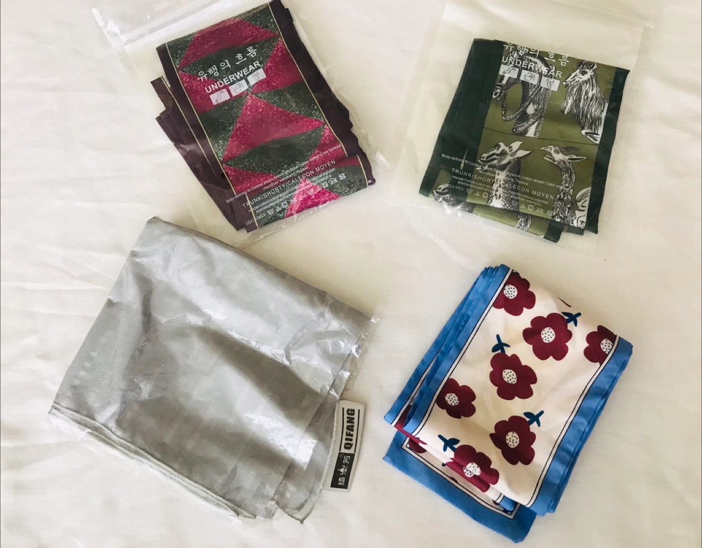 The scarves are with floral and patterned designs. They are all still in their original packaging!