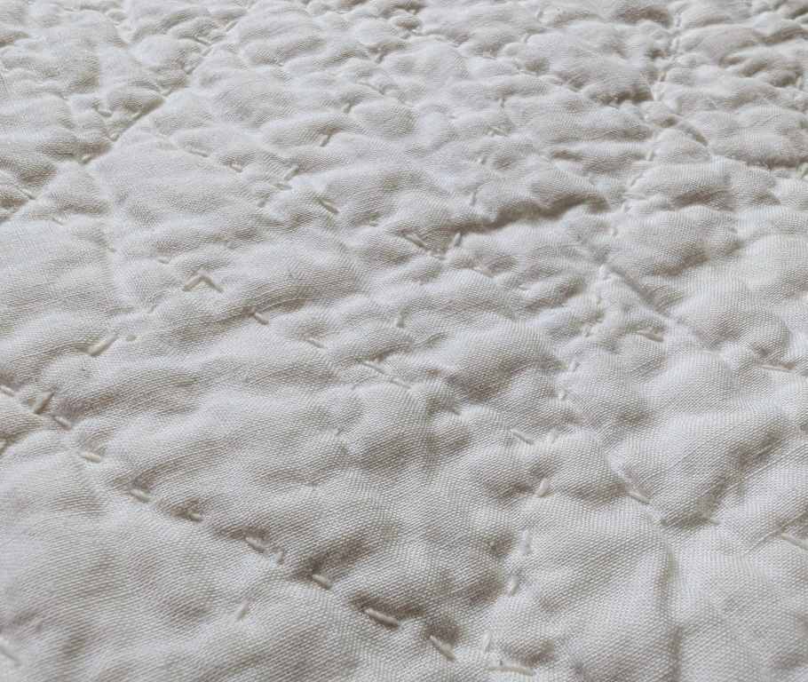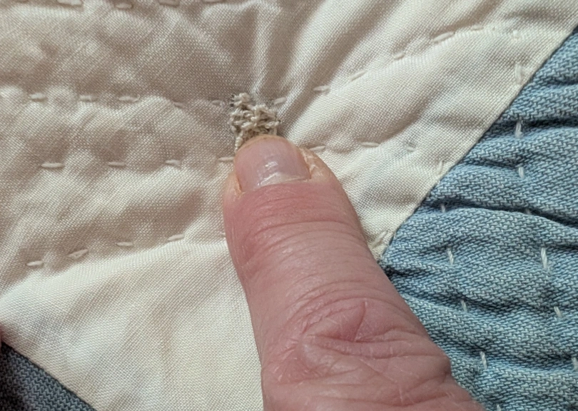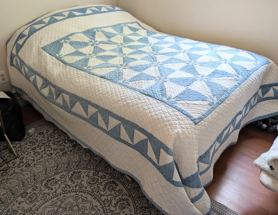 Classic Hunter's Star Pattern ~ hand stitched quilt. Blue & white cotton linen. Two minor flaws as shown. Easy repair. Measures approximately 95 inches x 87 inches. Good condition. Freshly cleaned. Fabulous farmhouse charm.