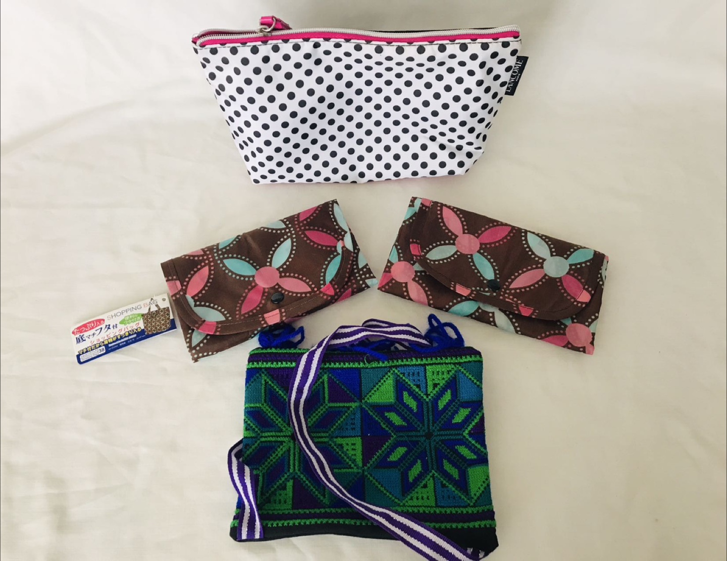 The shopping bags have a cute floral pattern. The Lancome bag is white with black polka dots and a pink zipper. The other pouch has green/blue patterns and is all purpose. Great for organizing your essentials!