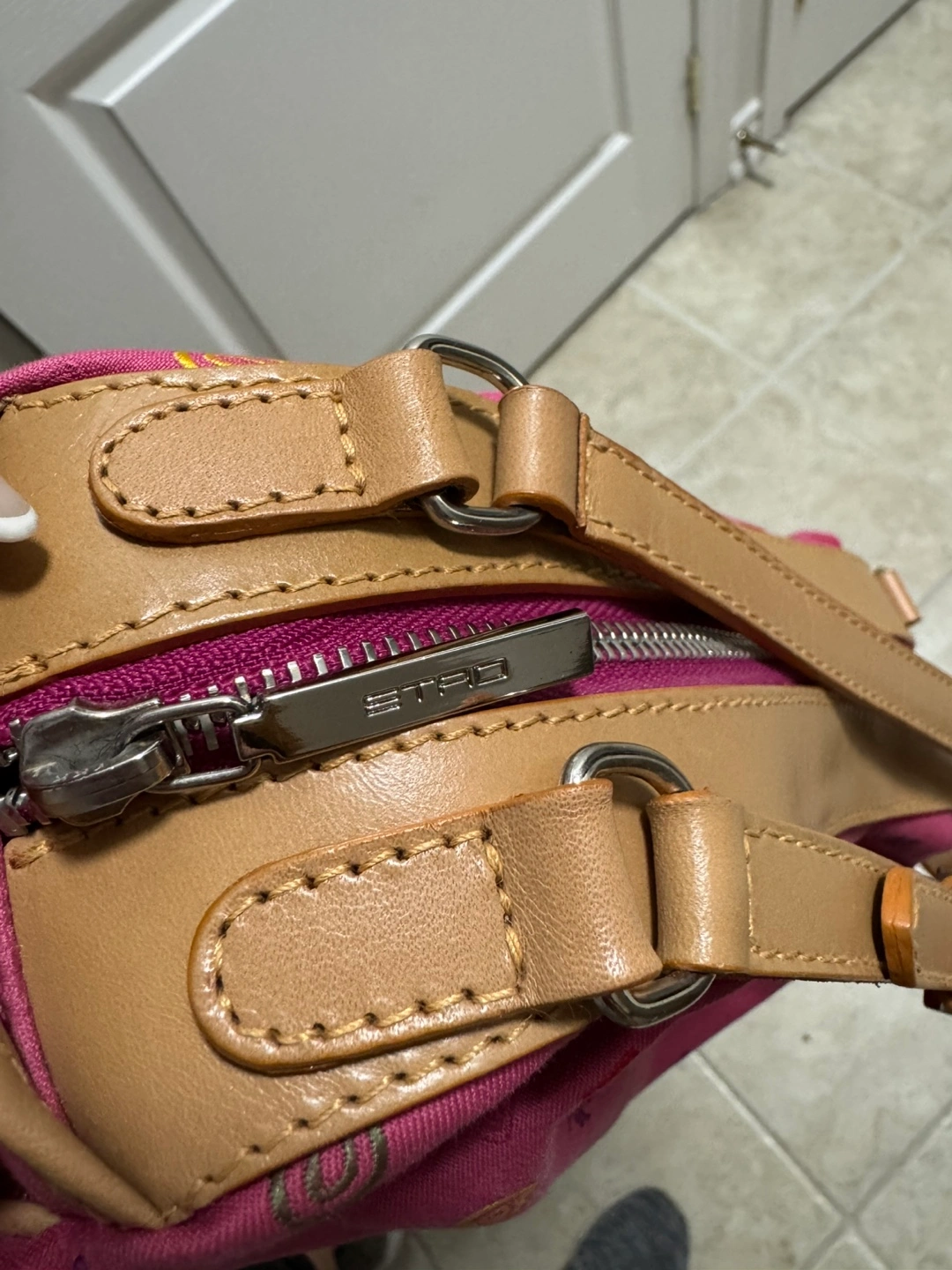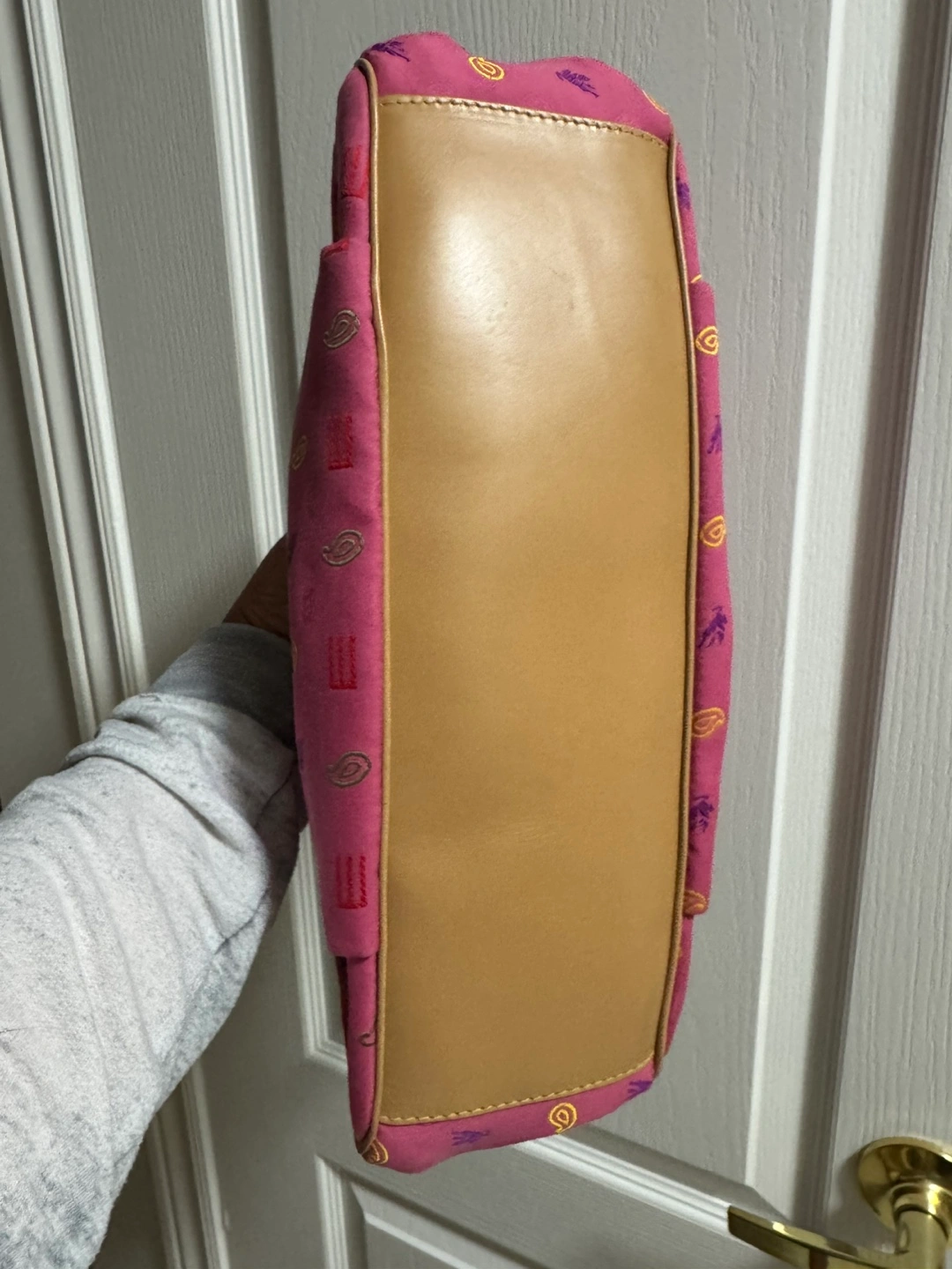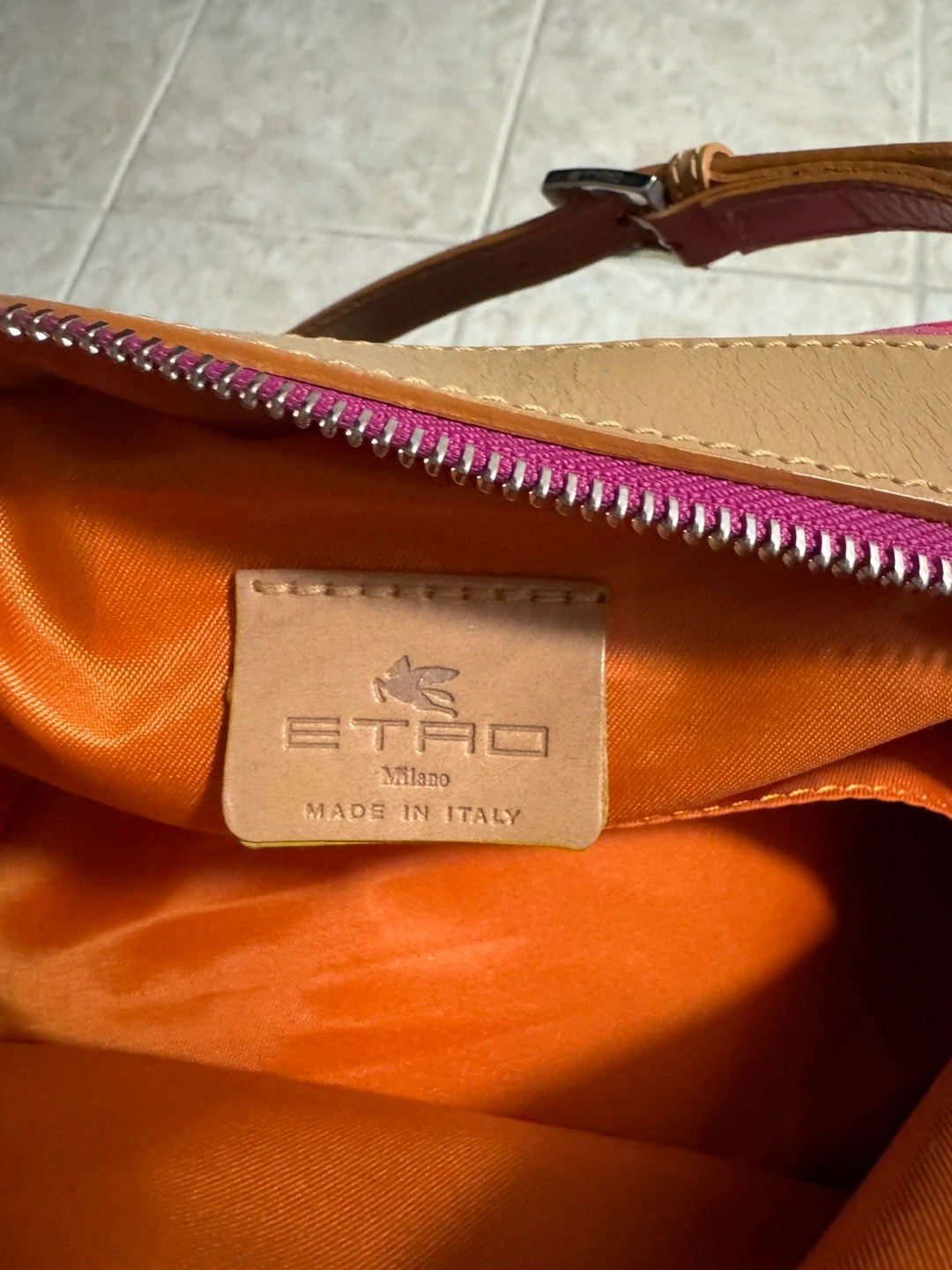 Gorgeous Etro shoulder bag in vibrant pink with colorful embroidery and tan leather trim. 100% authentic - never used. Adjustable strap and zip closure. A standout piece perfect for spring/summer or gifting!