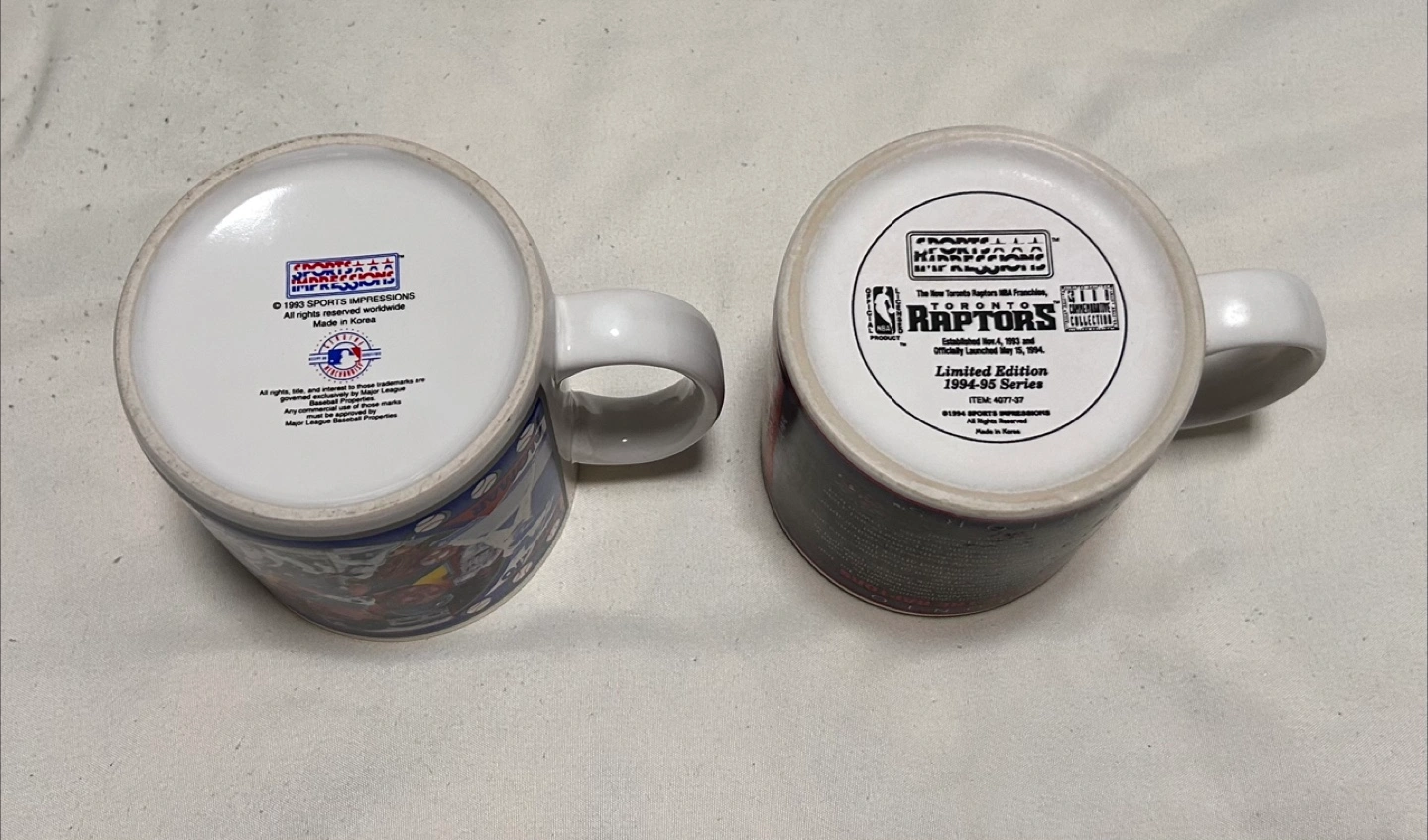 Selling a pair of commemorative mugs from Sports Impressions! One features the Toronto Raptors, and the other showcases the Toronto Blue Jays. Both are from the Limited Edition 1994-95 Series. Great for any sports fan!👍🏼