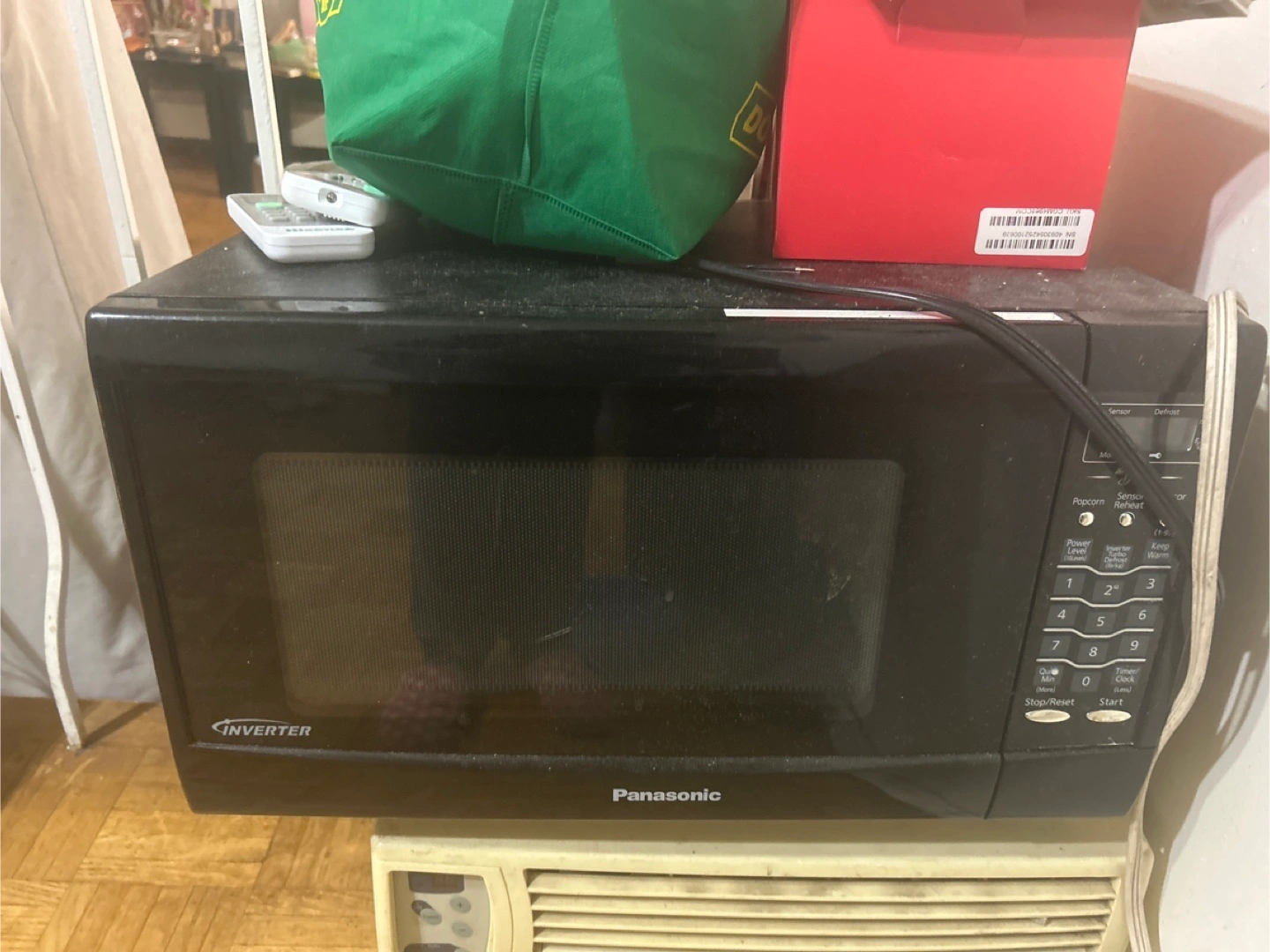 Selling a Panasonic Inverter microwave. It has settings for popcorn, reheat, and defrost. The control panel has a number pad and quick minute settings. It's a great addition to any kitchen!