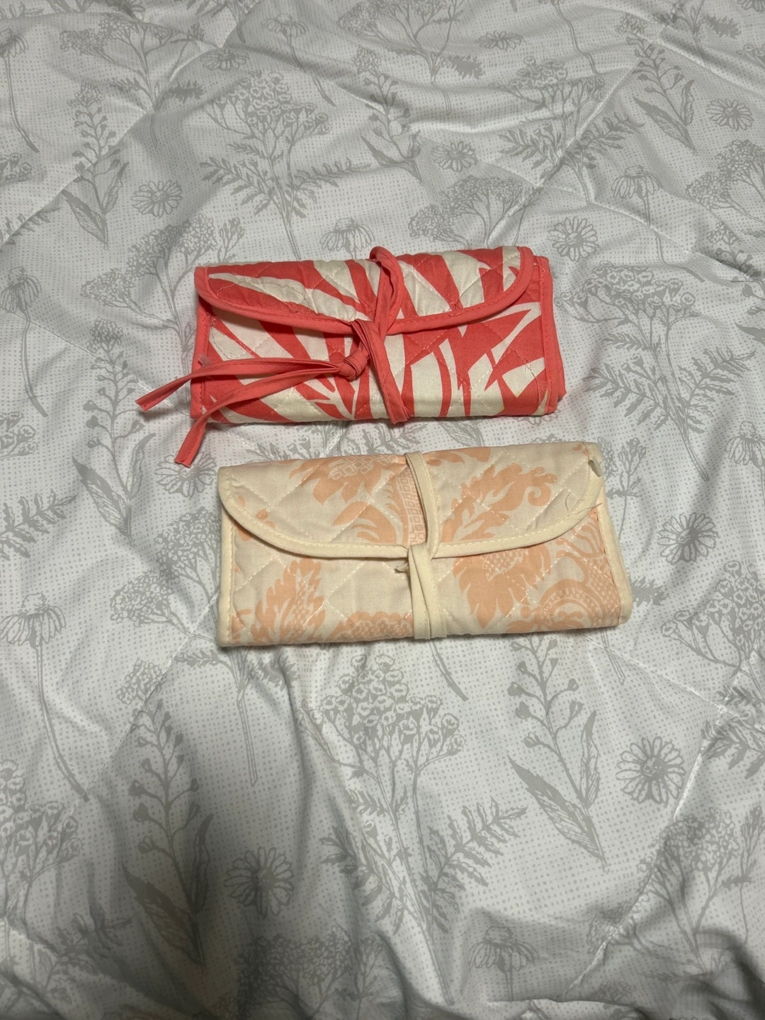 Selling a set of two hanging travel toiletry organizers! They're perfect for keeping your toiletries organized while you're on the go. One is white and coral, and the other is white and peach. Both have multiple clear zippered compartments to easily see and access your items. They are in great condition!