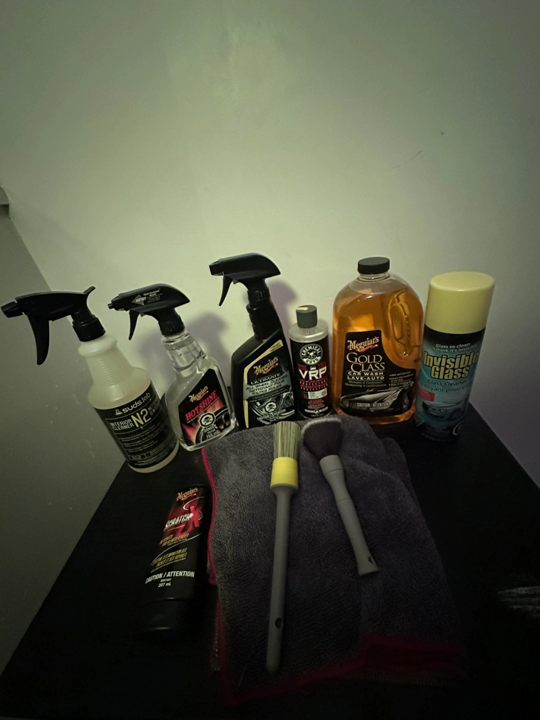 Auto detailing chemicals, microfibre towels, brushes