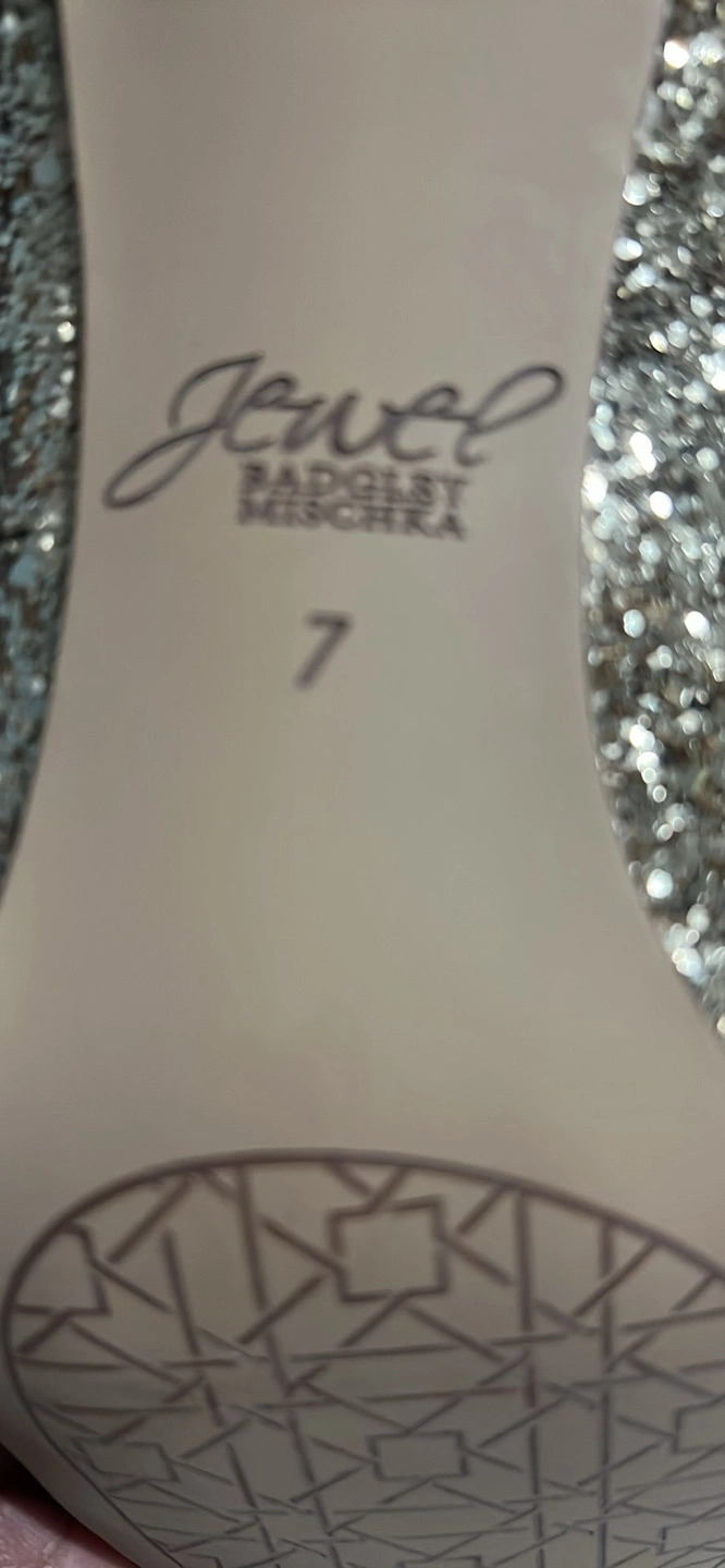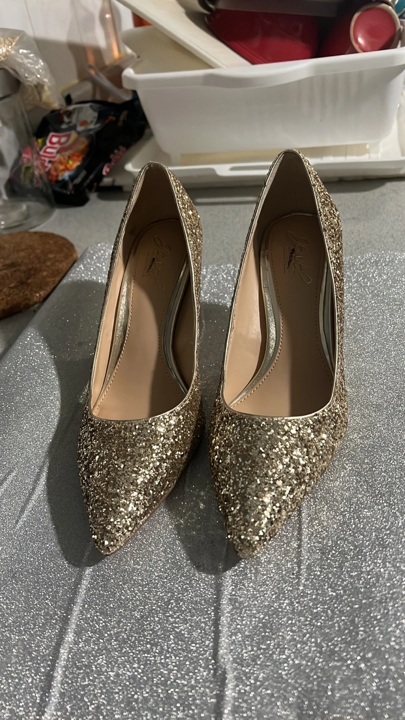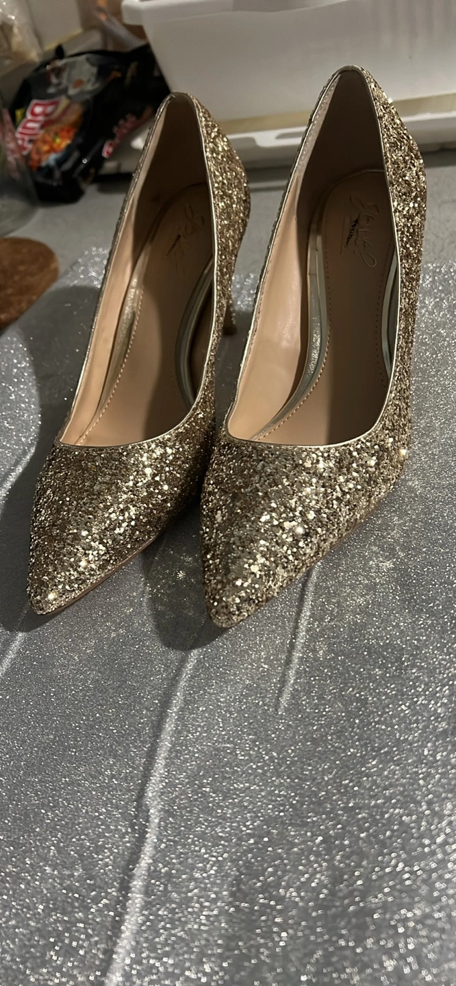 Selling a pair of Jewel Badgley Mischka heels in a beautiful gold glitter finish! They are a size 7 and would be perfect for a special occasion or to add some sparkle to your outfit. These are not used shoes