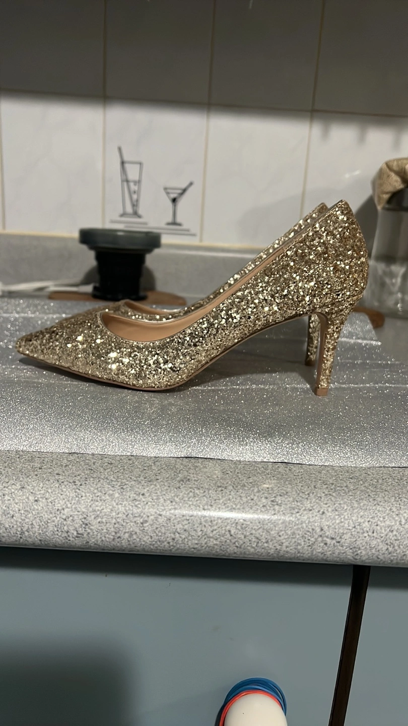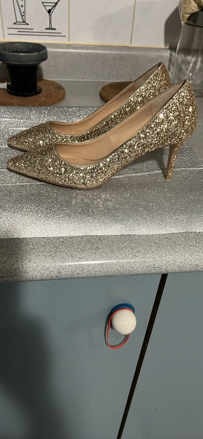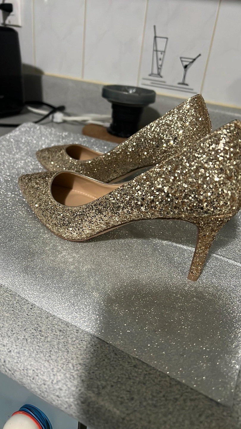 Selling a pair of Jewel Badgley Mischka heels in a beautiful gold glitter finish! They are a size 7 and would be perfect for a special occasion or to add some sparkle to your outfit. These are not used shoes