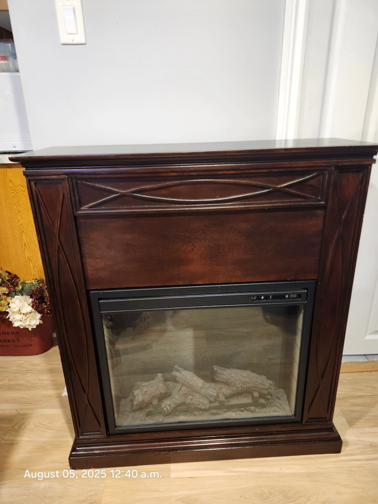 Here's a lovely electric fireplace with a wood finish. It's in great shape and ready to add some warmth and ambiance to your space!