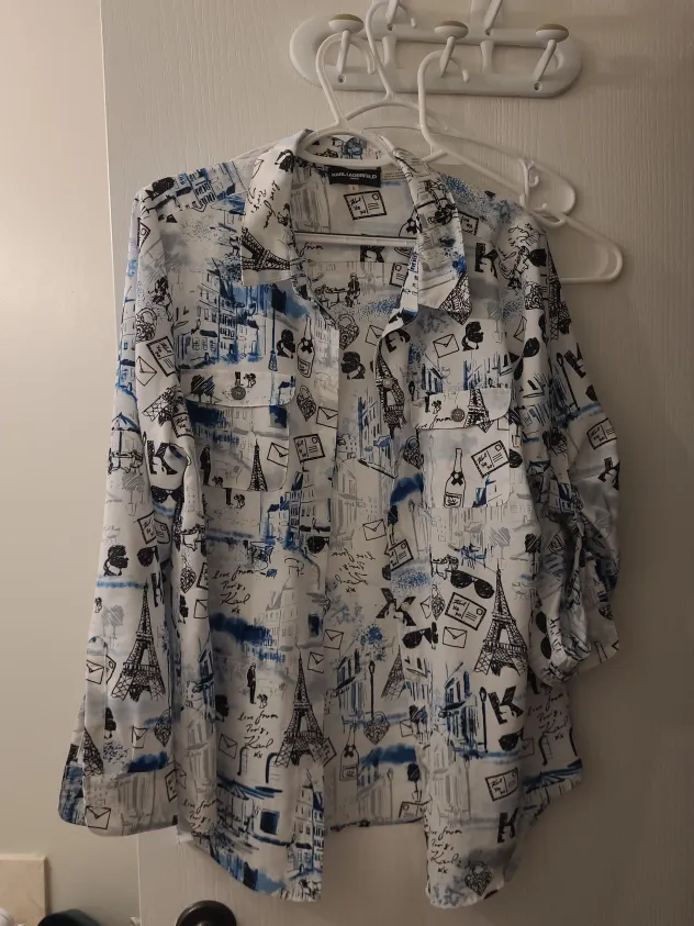 Selling a Karl Lagerfeld Paris blouse in size L. The blouse features a unique print with Eiffel Tower and other Parisian motifs. It's in great condition and ready for a new home!