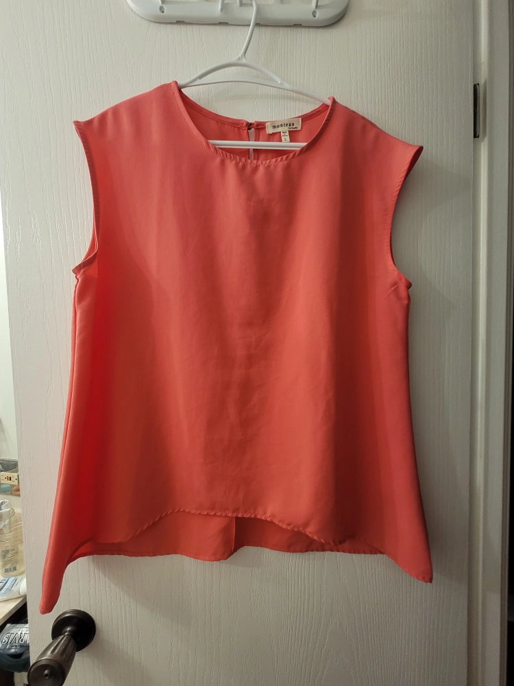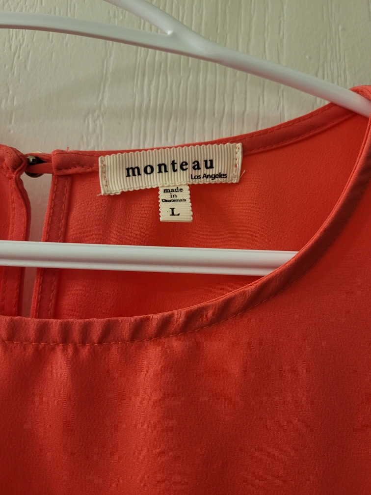 I'm selling a coral-coloured top from Monteau Los Angeles. It's a size large and made in Guatemala. It's in great condition and ready for a new home