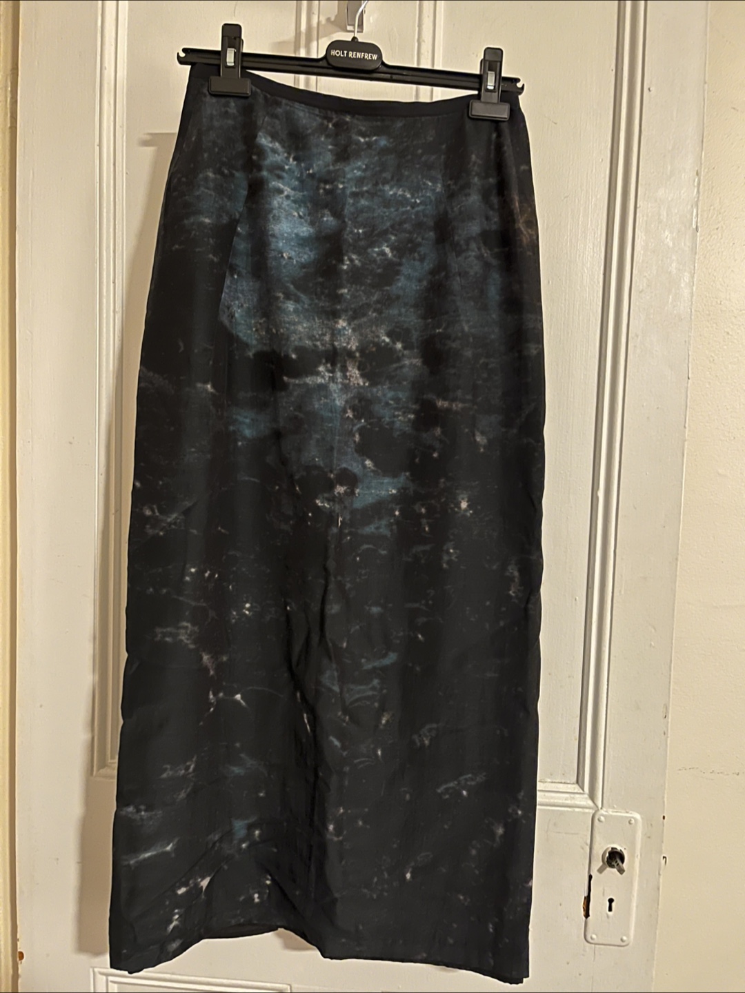 JF & Son cotton silk blend and silk lined maxi skirt. A very serene oceanic print. Fits like a women’s 6 if you got a curvy backside and women’s 8 if a ruler shape.