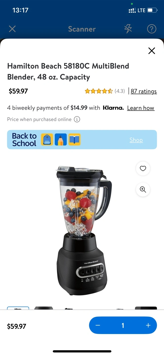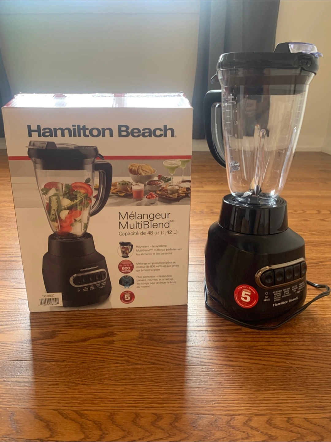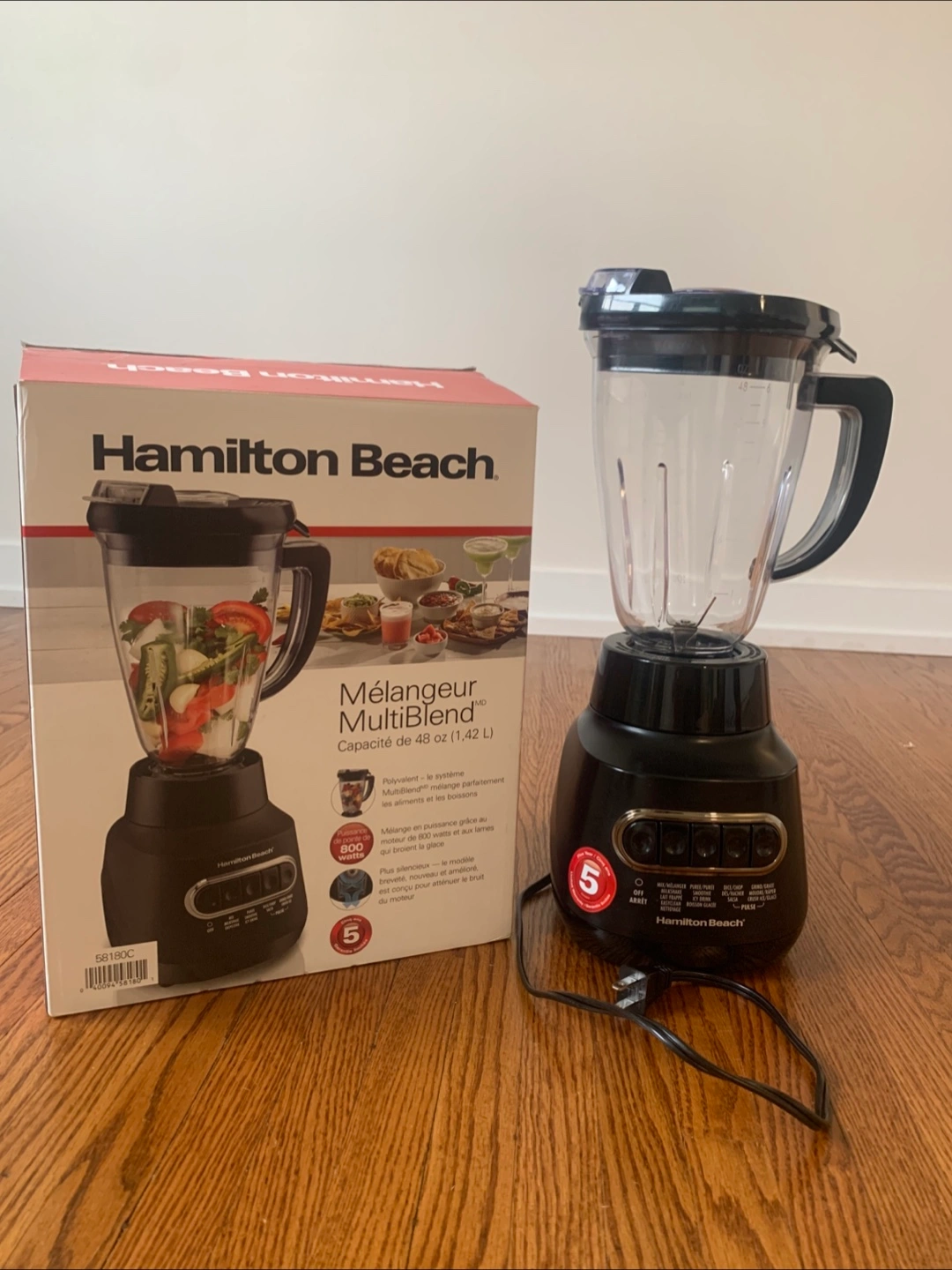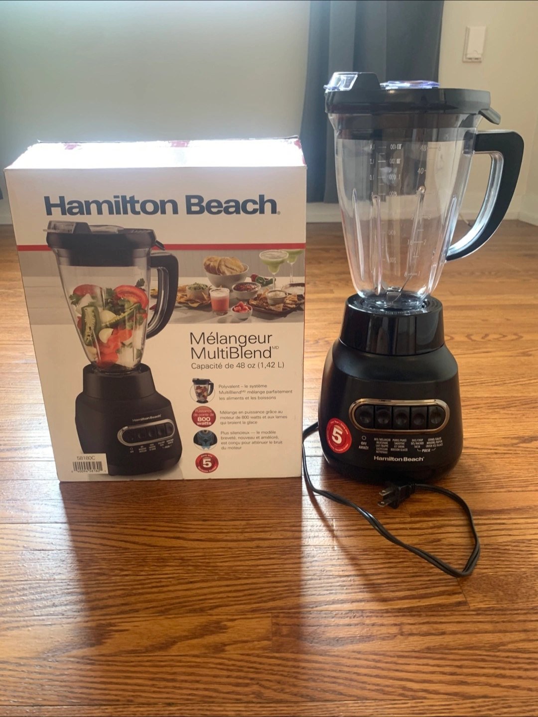 Selling a Hamilton Beach MultiBlend blender in excellent condition! It's the 58180C model with a 48 oz capacity. The blender has 800 watts of power and 5 speeds. It comes with the original box.
