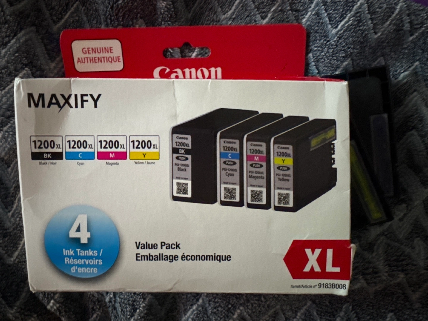 Selling a brand new, unopened Canon MAXIFY 1200XL Value Pack! It includes 7 XL ink tanks: 1 Full opened black, 2 cyan, 2 magenta, and 2 yellow. Perfect for your MAXIFY printer!