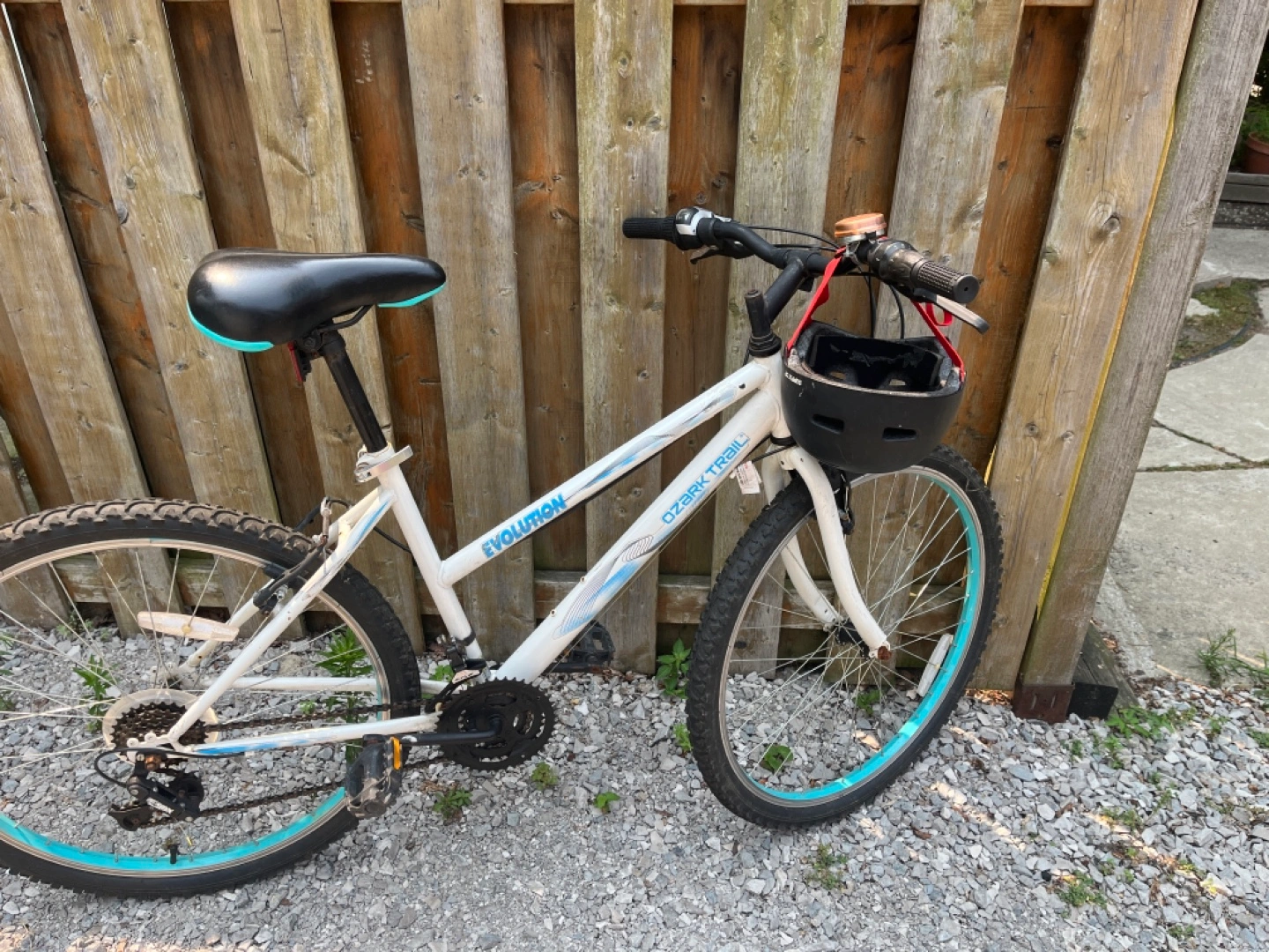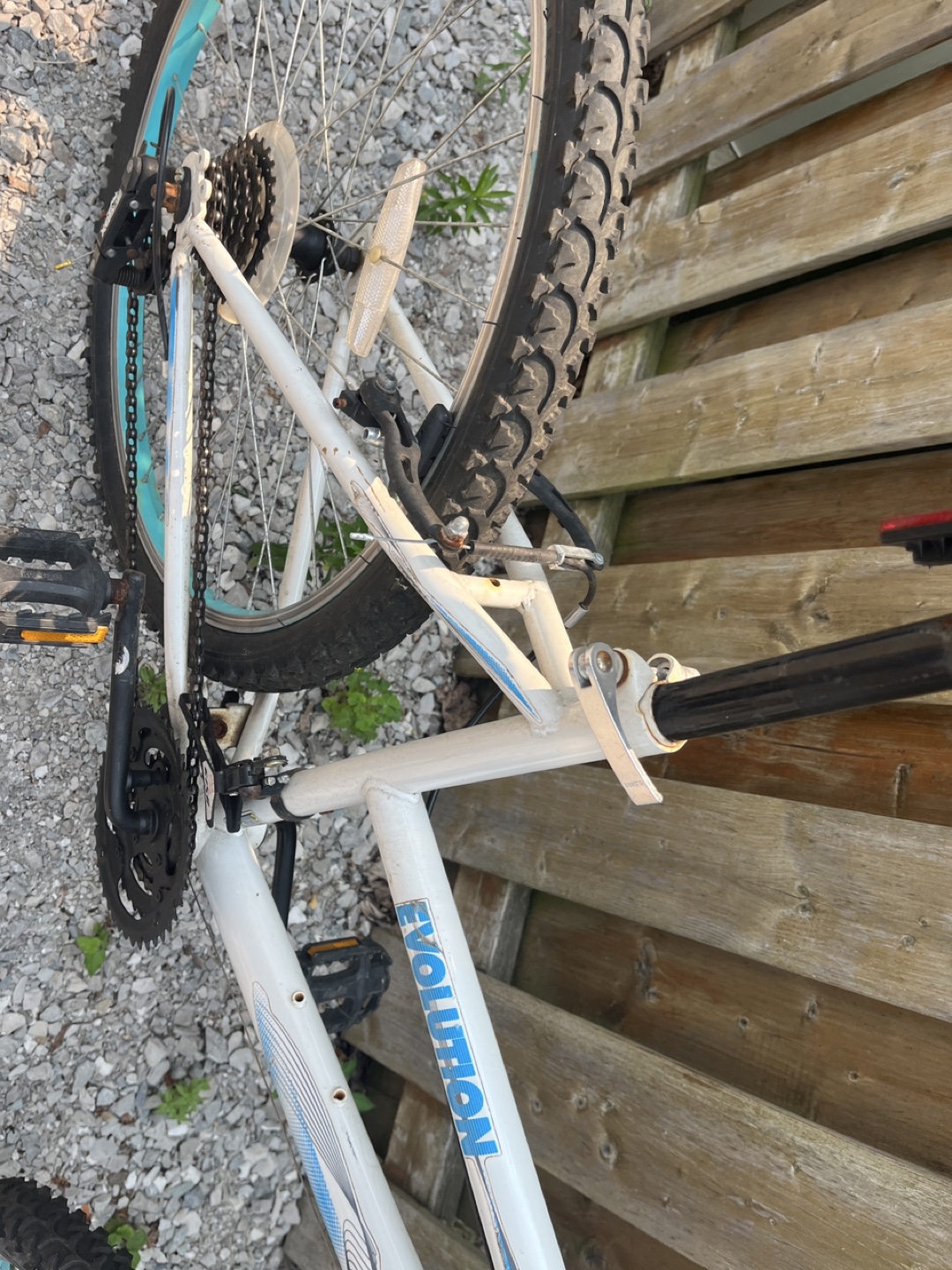 Selling an Ozark Trail Evolution mountain bike. It's white with light blue accents on the rims and frame. The bike has a RevoShift gear system. Perfect for hitting the trails! Brakes need adjusting.