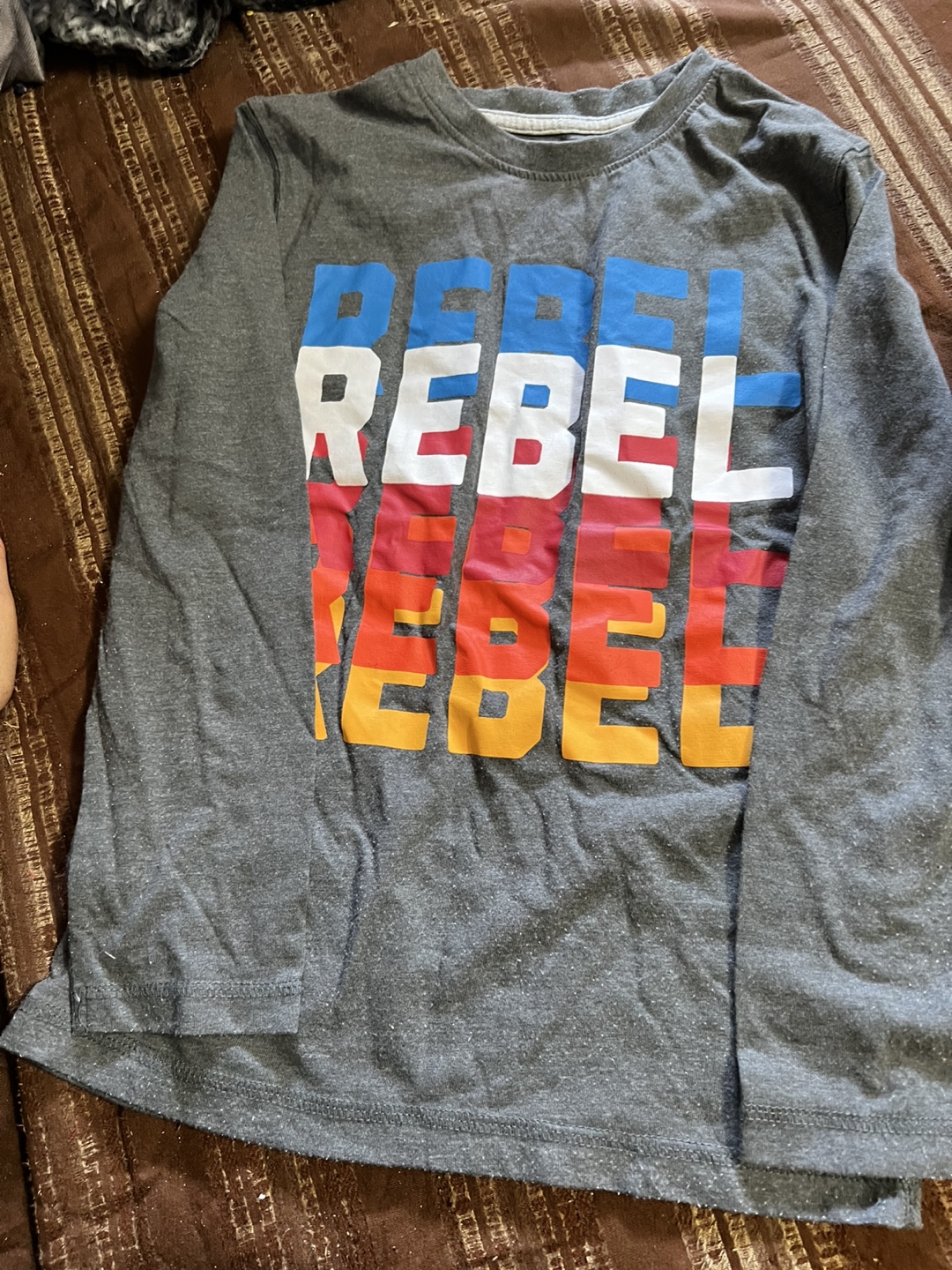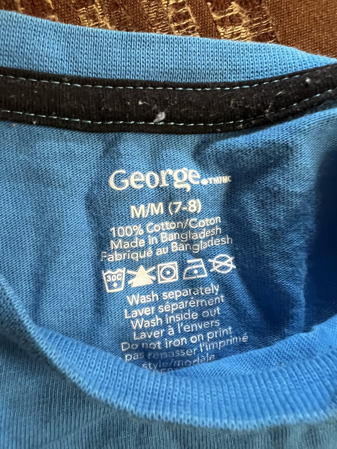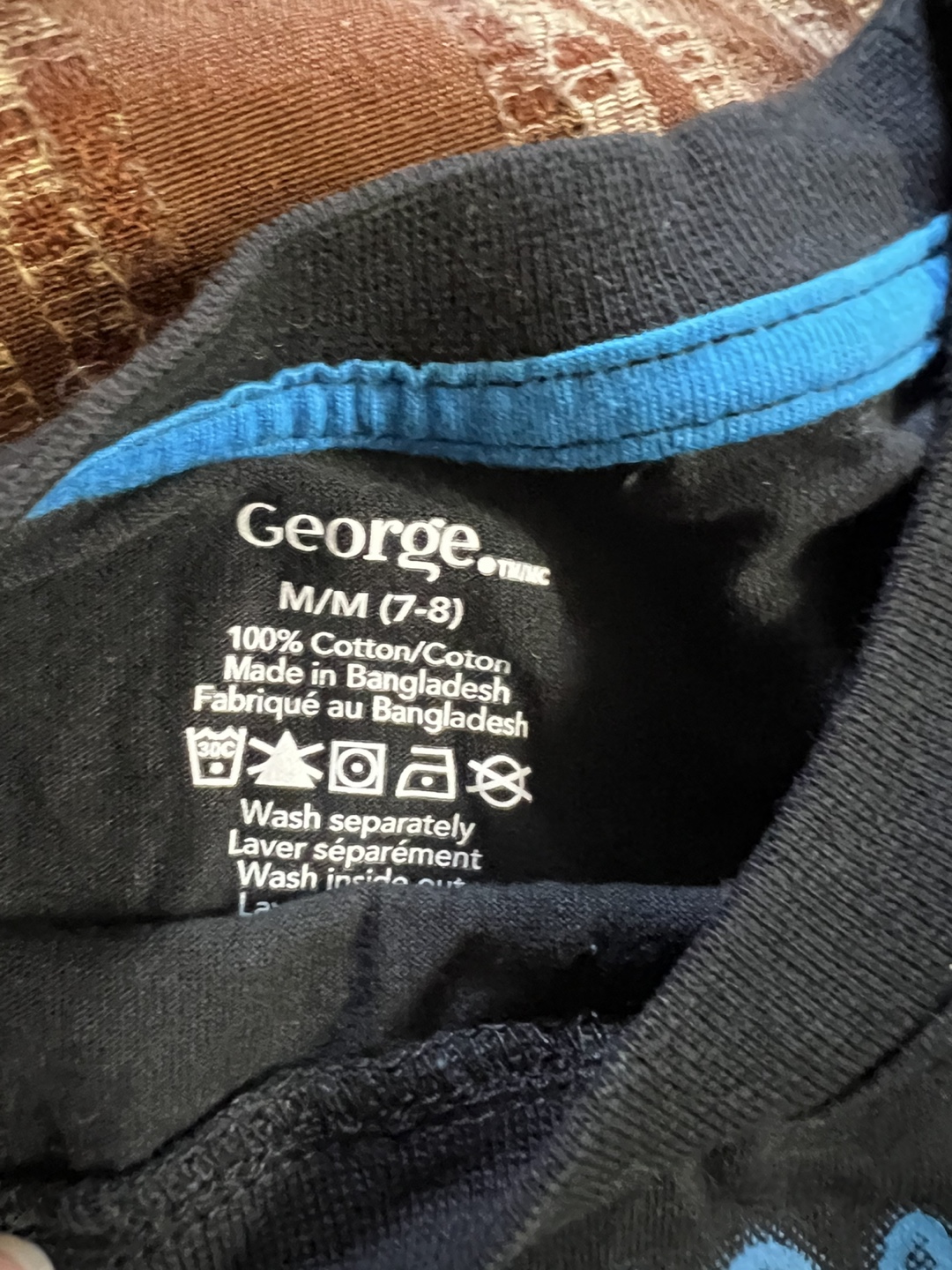 Selling a set of George brand gently used long-sleeve (15) fifteen shirts for kids, size M (7-8). There's a grey shirt with a 'Rebel' design, a blue shirt with a soccer ball, and a black shirt with an arcade game design. All shirts are made of 100% cotton