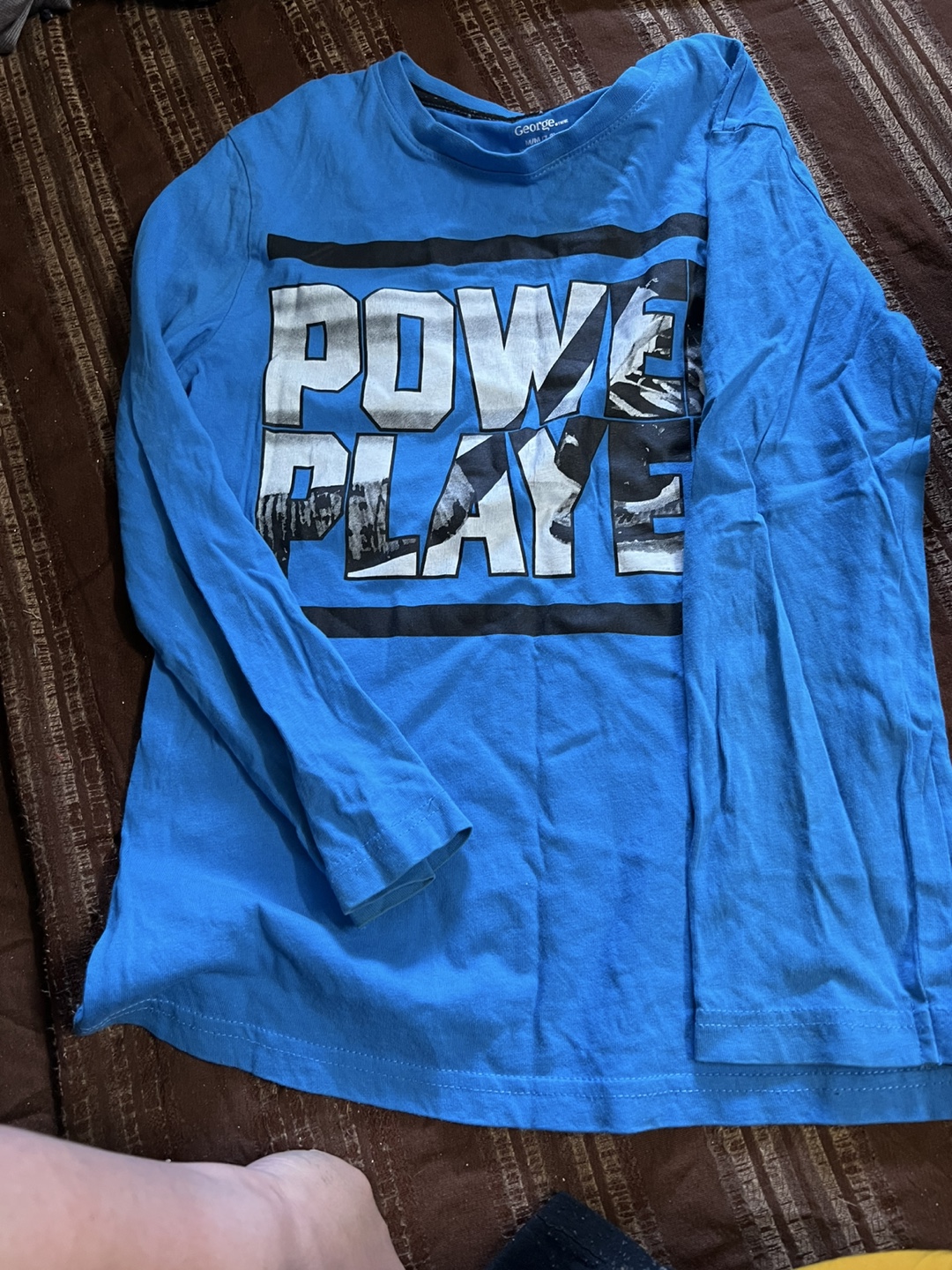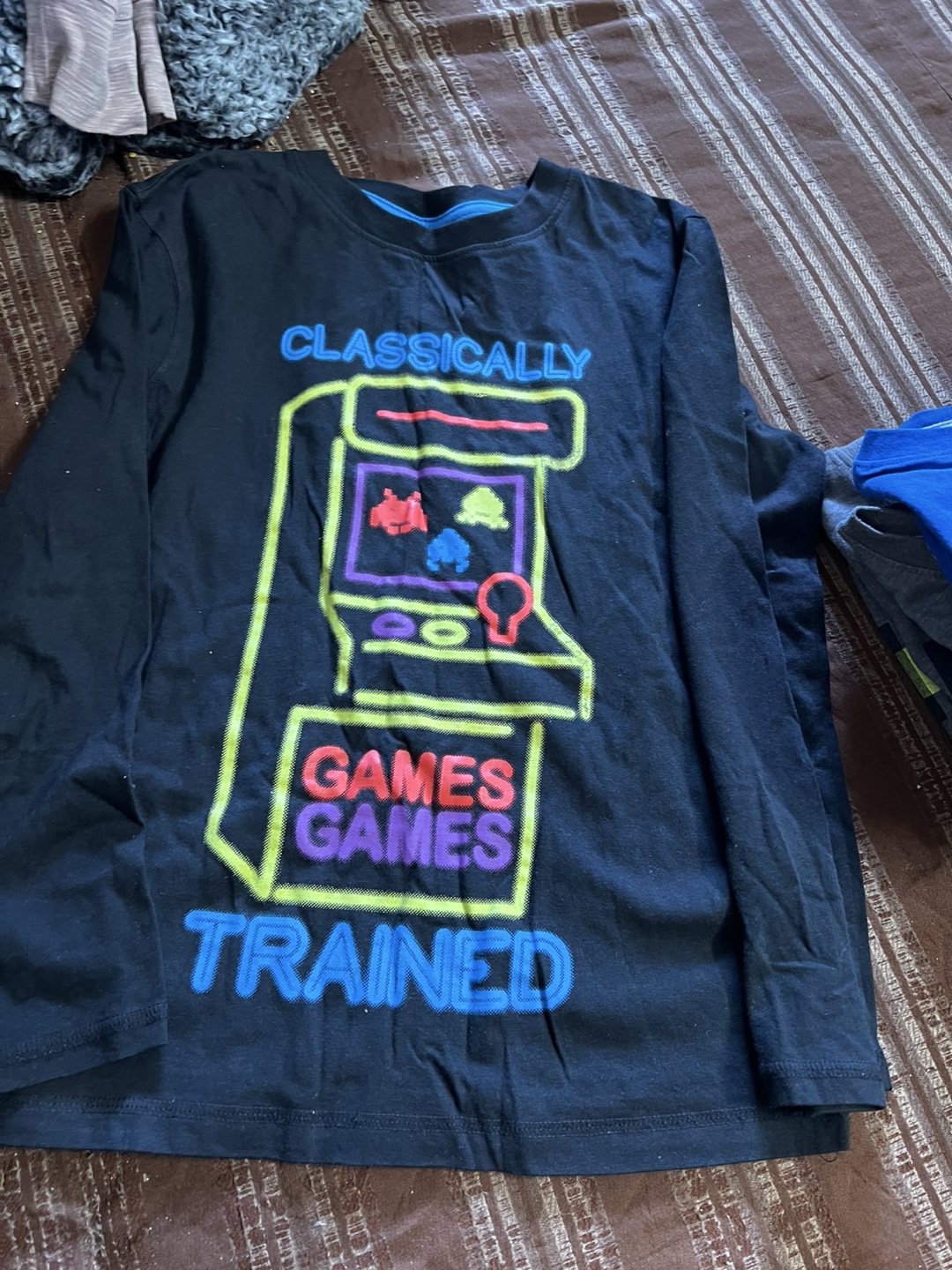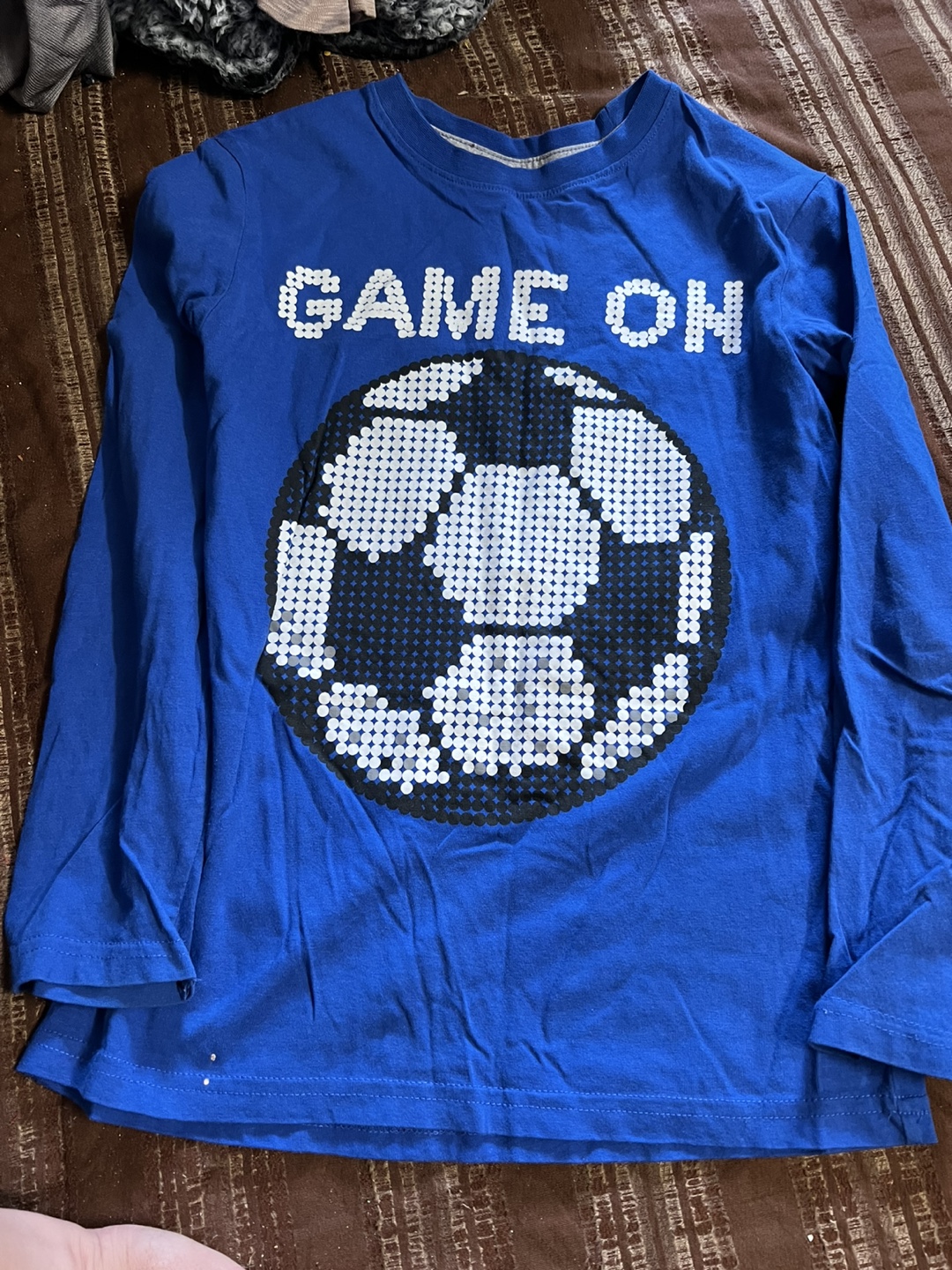 Selling a set of George brand gently used long-sleeve (15) fifteen shirts for kids, size M (7-8). There's a grey shirt with a 'Rebel' design, a blue shirt with a soccer ball, and a black shirt with an arcade game design. All shirts are made of 100% cotton