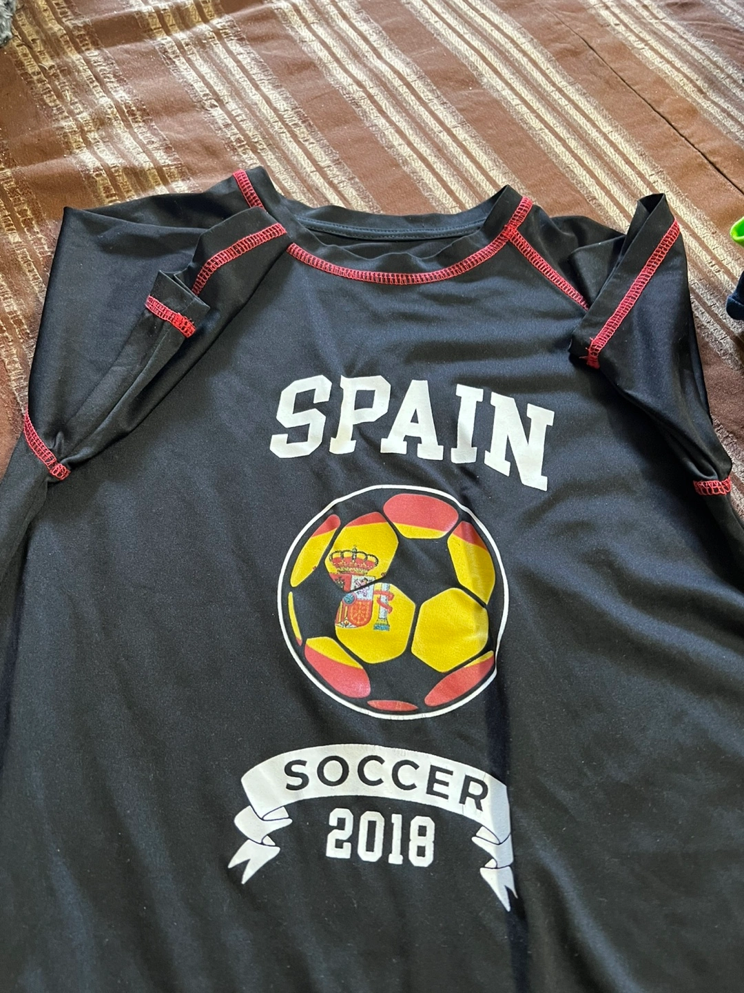 - Black long-sleeved t-shirt with 'SPAIN SOCCER 2018' graphic