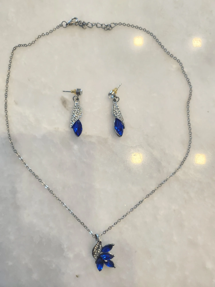 Selling a cute necklace and earring set! The necklace has a delicate chain with a leaf-like pendant, and the earrings complement it perfectly with a similar design featuring blue accents.