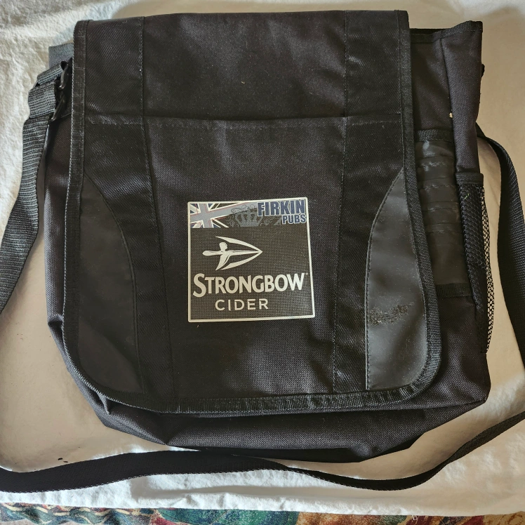 Black messenger bag with a Strongbow Cider logo. It has multiple compartments and pockets for organization. Perfect for carrying books, laptops, or other essentials. The bag is in great condition. Pick up.