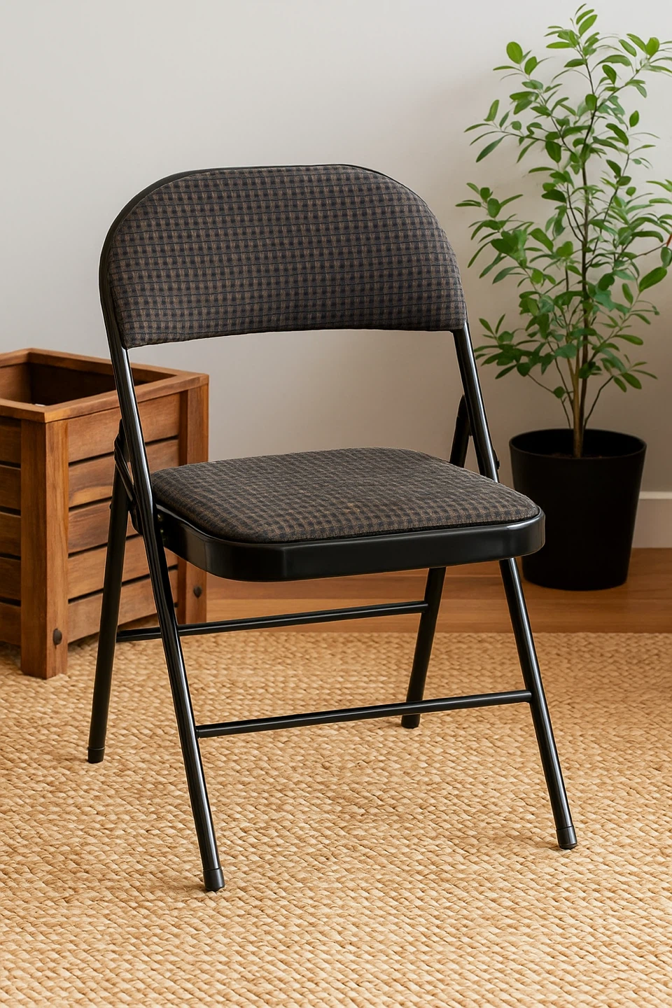 Selling a folding chair with a black metal frame and a patterned fabric seat and back. It's in good condition with a few paint splatters. Perfect for extra seating when you have guests over. Folds up easily for storage!