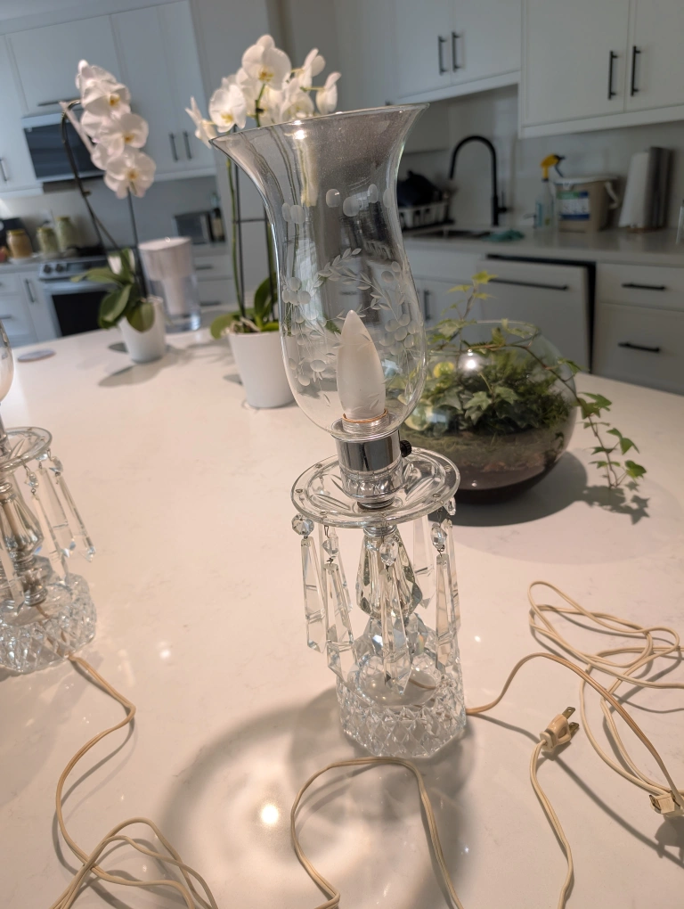 Selling a pair of elegant crystal hurricane lamps. They would look great on a bedside table or as accent lighting in your living room. They're in good condition and ready to brighten up your home!
