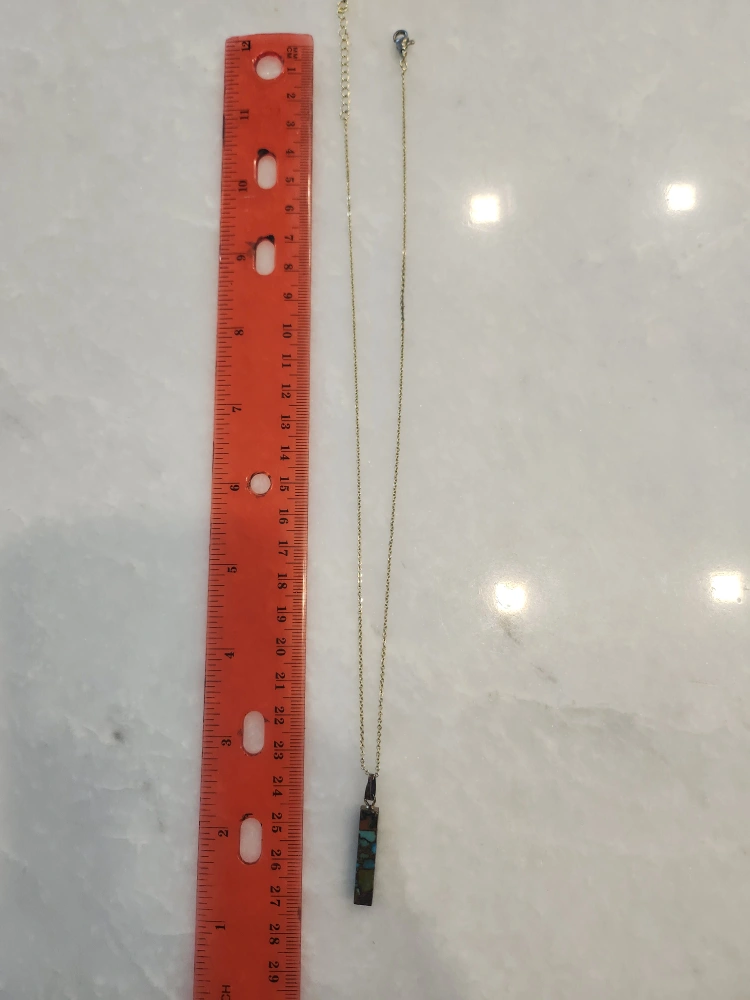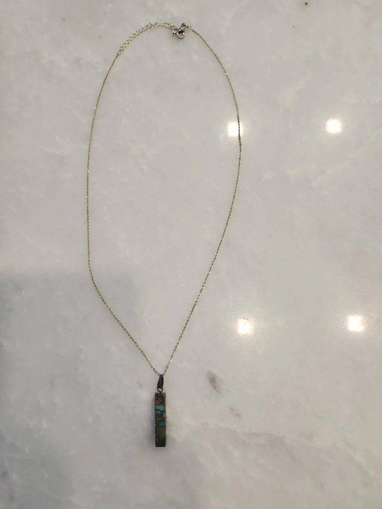 Here's a lovely necklace with a turquoise stone pendant! The pendant has a rectangular shape with a mix of blue and brown hues. The chain is a delicate gold colour. It's in great condition and ready to add a touch of unique style to your outfits