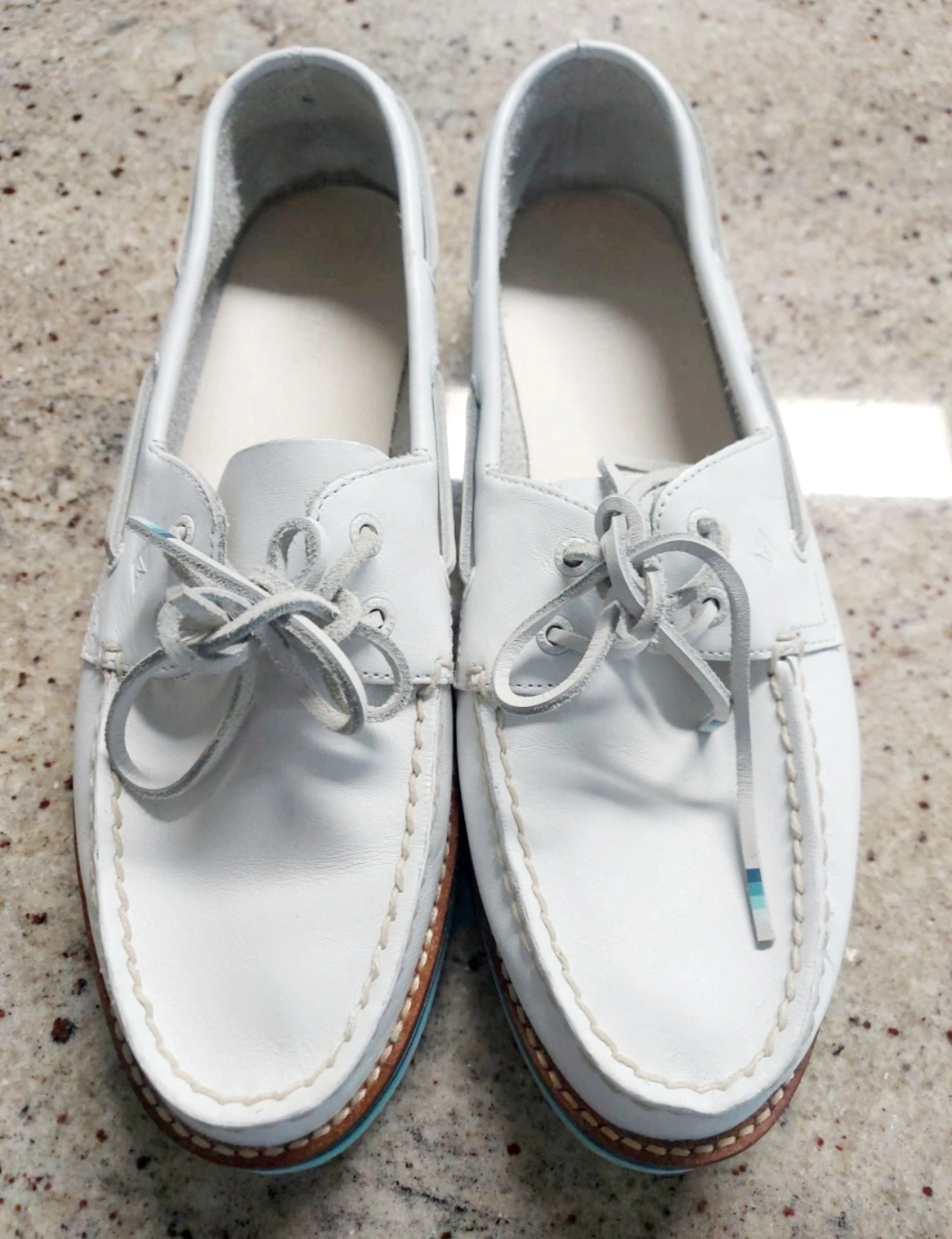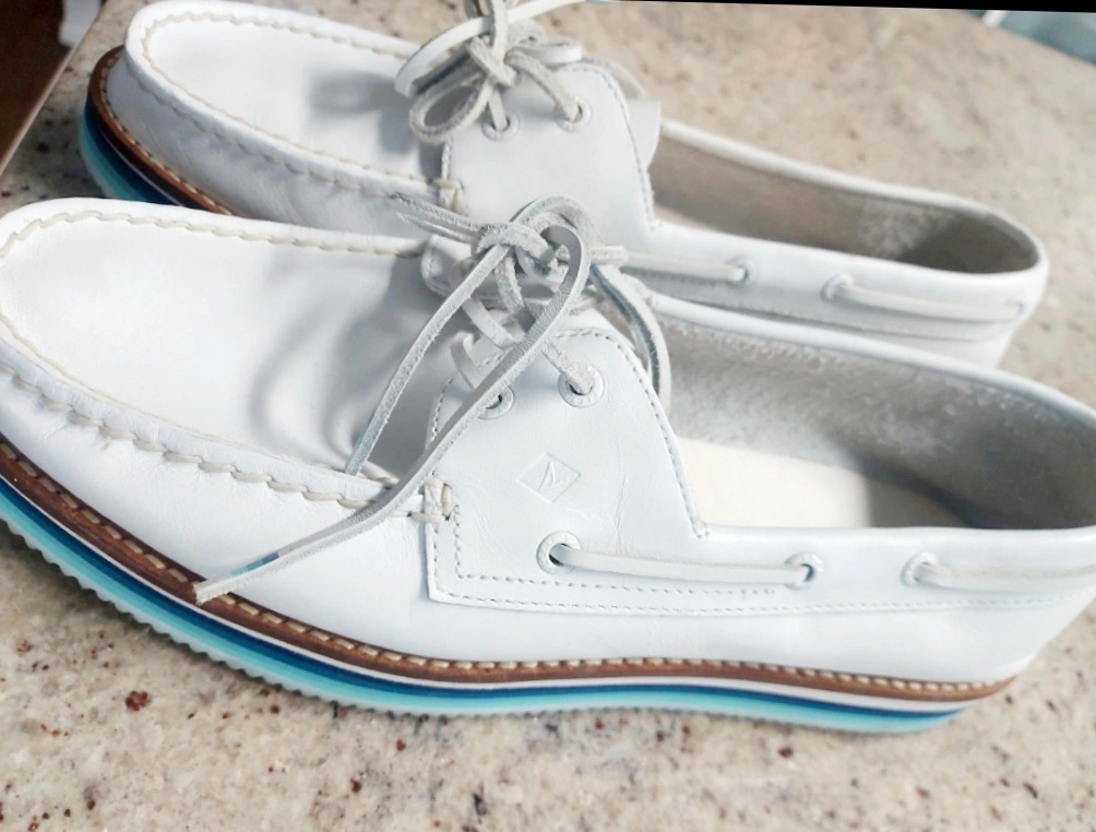 Selling a pair of Sperry Top-Sider boat shoes in white leather. They're in great shape and ready for a new home. A classic style that's perfect for spring and summer!