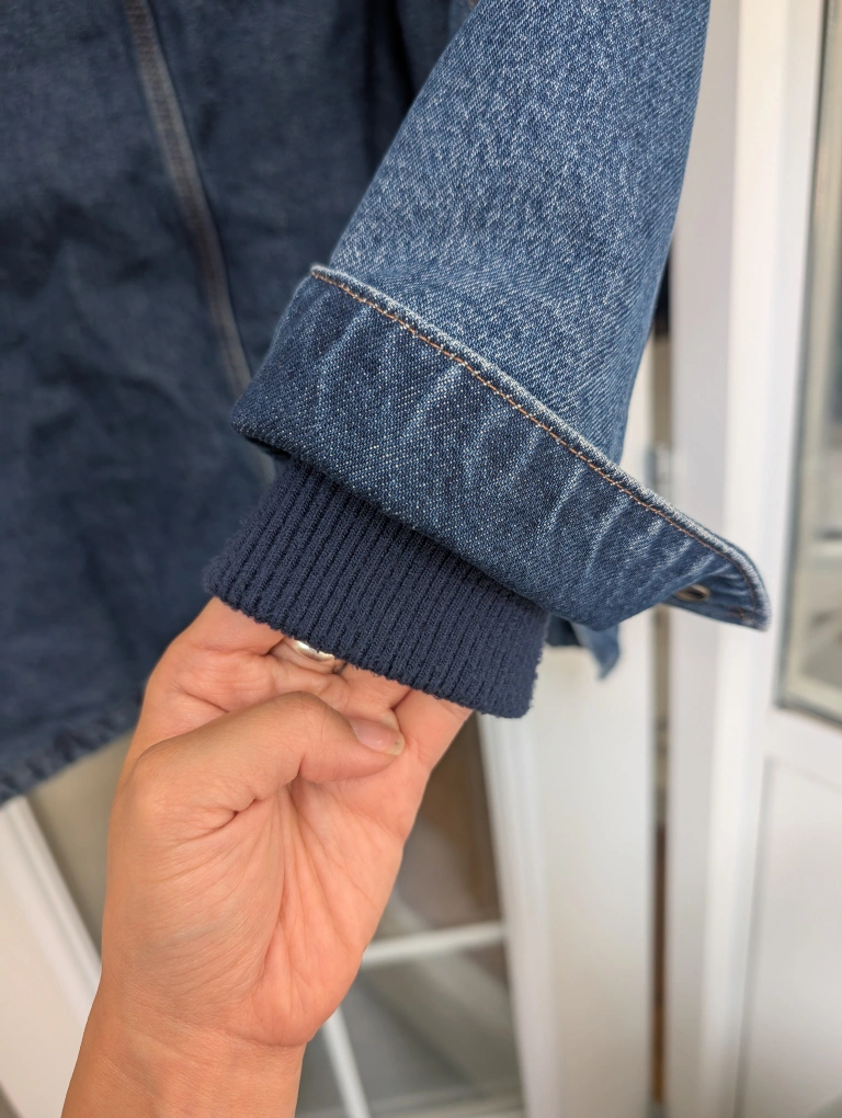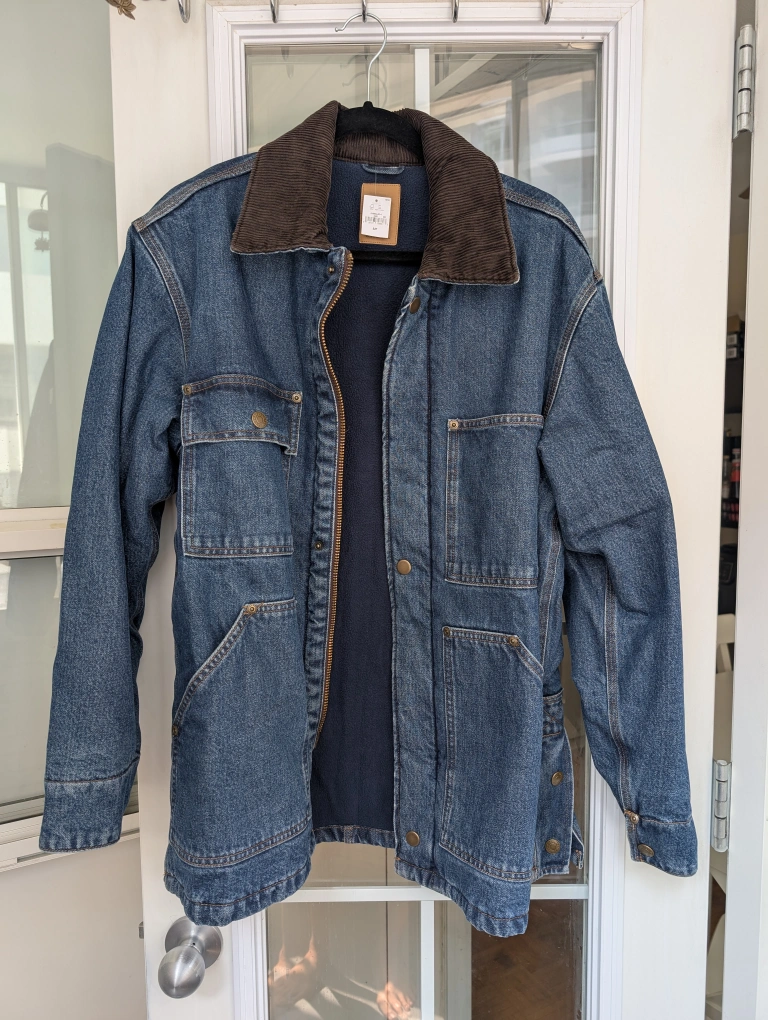 Selling a NEW GAP denim chore jacket in size small for men! It features a corduroy collar and a cozy fleece lining. Perfect for layering during the cooler months!